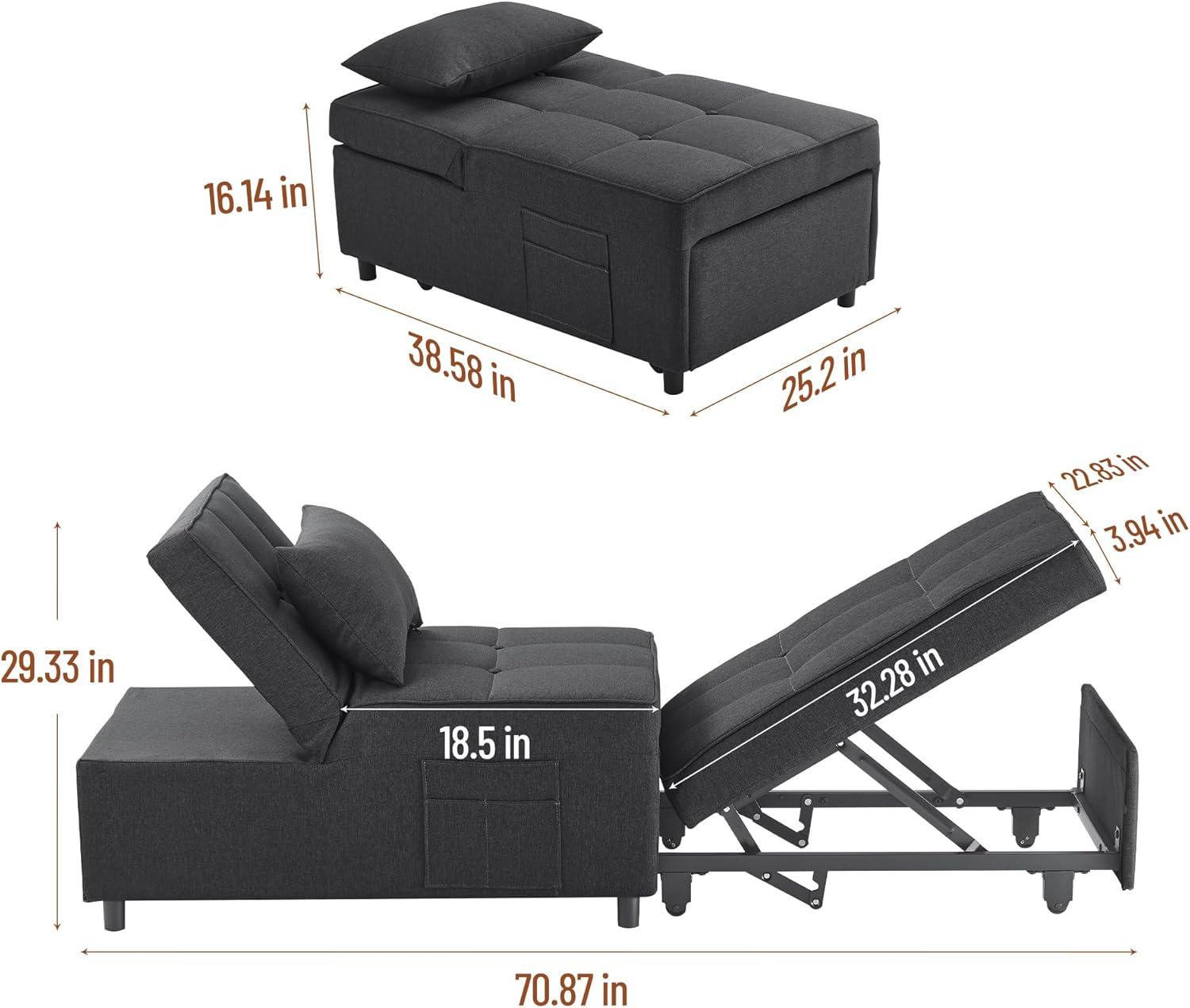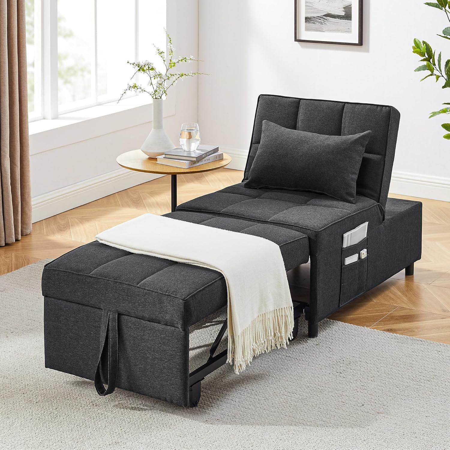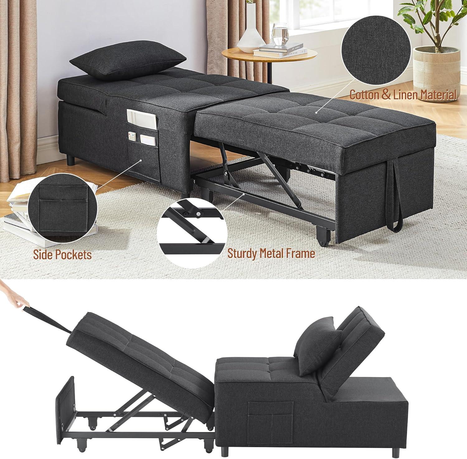 When arranging this versatile piece in our living room or bedroom, its adaptability truly shines. The multiple adjustable backrest levels allow us to tailor comfort precisely whether we’re settling in for a movie night, unwinding with a book, or taking a quick nap. Its 4-in-1 functionality means it serves as a cozy chair, a recliner for leisure, a convenient ottoman, or a guest bed without crowding the space. The dark gray tone blends seamlessly with modern and minimalist decors, and the breathable linen fabric paired with high-density foam keeps comfort at the forefront. The built-in side pockets are perfect for storing remote controls, magazines, or phones, creating a neat and practical setup.