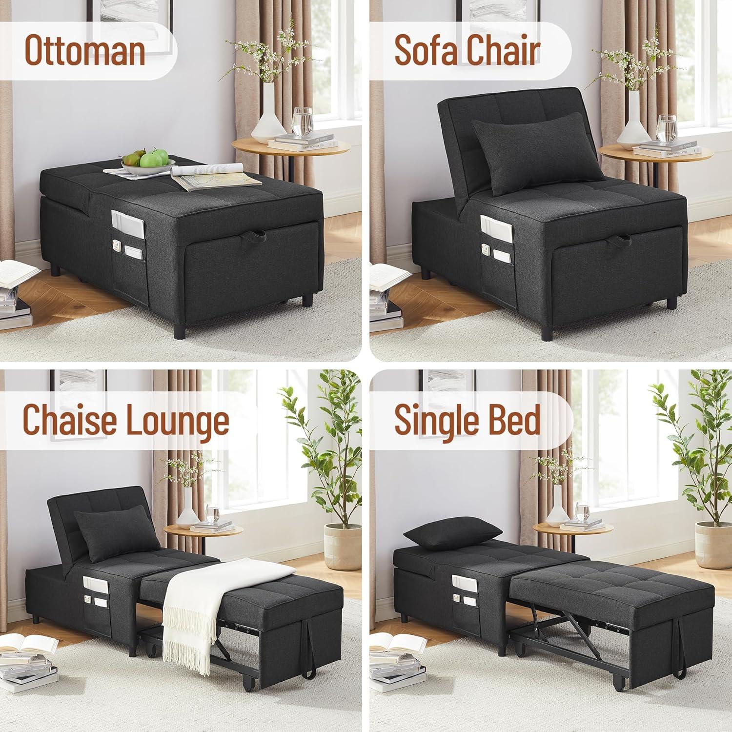 Discovering the true adaptability of this piece has been a game changer for our living and sleeping arrangements. its 4-in-1 multifunctional design lets us transition seamlessly between a sofa chair, recliner, bed, and ottoman, adapting to whatever mood or need arises. Whether we want to relax with a book, catch up on gaming, or even take a quick nap, the different reclining positions provide ideal support and comfort.The thoughtful inclusion of large side pockets on both sides helps us keep essentials like remotes and magazines perfectly within reach, neatly organized and out of the way.