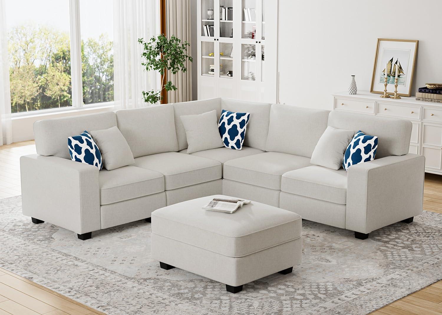 This modular sectional sofa truly stands out with its flexible design that can be adapted effortlessly to fit various living spaces. Whether arranged in a U-shape, L-shape, or any custom layout, it accommodates evolving room setups and growing families perfectly.Its cream upholstery offers a modern yet timeless appeal, blending seamlessly with different décor styles. the inclusion of an ottoman enhances versatility, allowing us to create an expansive lounging area or a cozy sleeping spot. Plus, the removable cushions make cleaning and maintenance hassle-free, helping keep the sofa looking fresh and inviting for years.