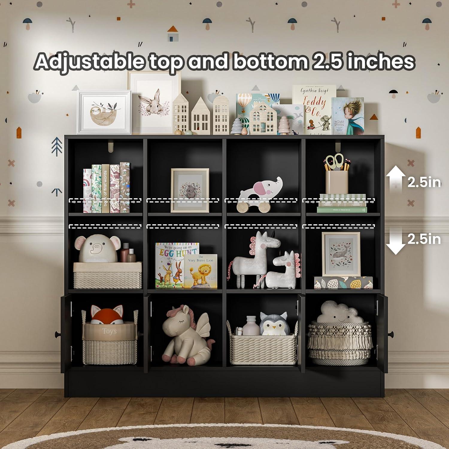 Our experience with this sleek black bookshelf has been quite positive, especially appreciating its clean, classic design that effortlessly complements various decor styles.Crafted from high-quality MDF, the sturdiness is instantly noticeable-it feels durable without being overly heavy. The 3-tier structure combined with 12 cubby spaces offers a wonderfully compact yet spacious storage solution, allowing us to organize books, toys, and decorative pieces with ease. The addition of doors on some compartments provides an excellent way to conceal clutter, keeping the overall room aesthetic tidy and polished. Plus, the anti-tilt device adds a layer of safety that is notably reassuring for families with young children.