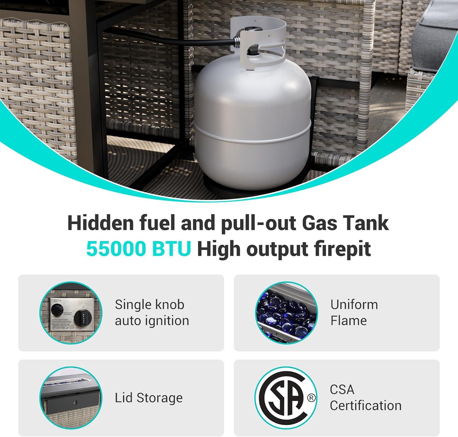 Our experience with this set has truly elevated our outdoor gatherings. The combination of ample seating-including armrest sofas, single sofas, a corner sofa, and the two uniquely comfortable 360° swivel rocking chairs-makes it perfect for both intimate and larger groups. The thick, ergonomic cushions provide comfort that lasts well into the evening, especially when paired with the standout feature: the 55,000 BTU fire pit table.Its simple single-button ignition and protective lid, which doubles as a coffee table, add both practicality and a cozy ambiance. We also appreciate the set’s durability; the UV-resistant and waterproof rattan is built to brave the elements, so it looks as fresh after months of sun and rain as it did on day one.