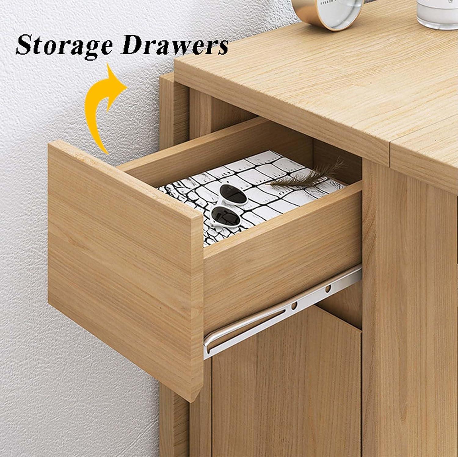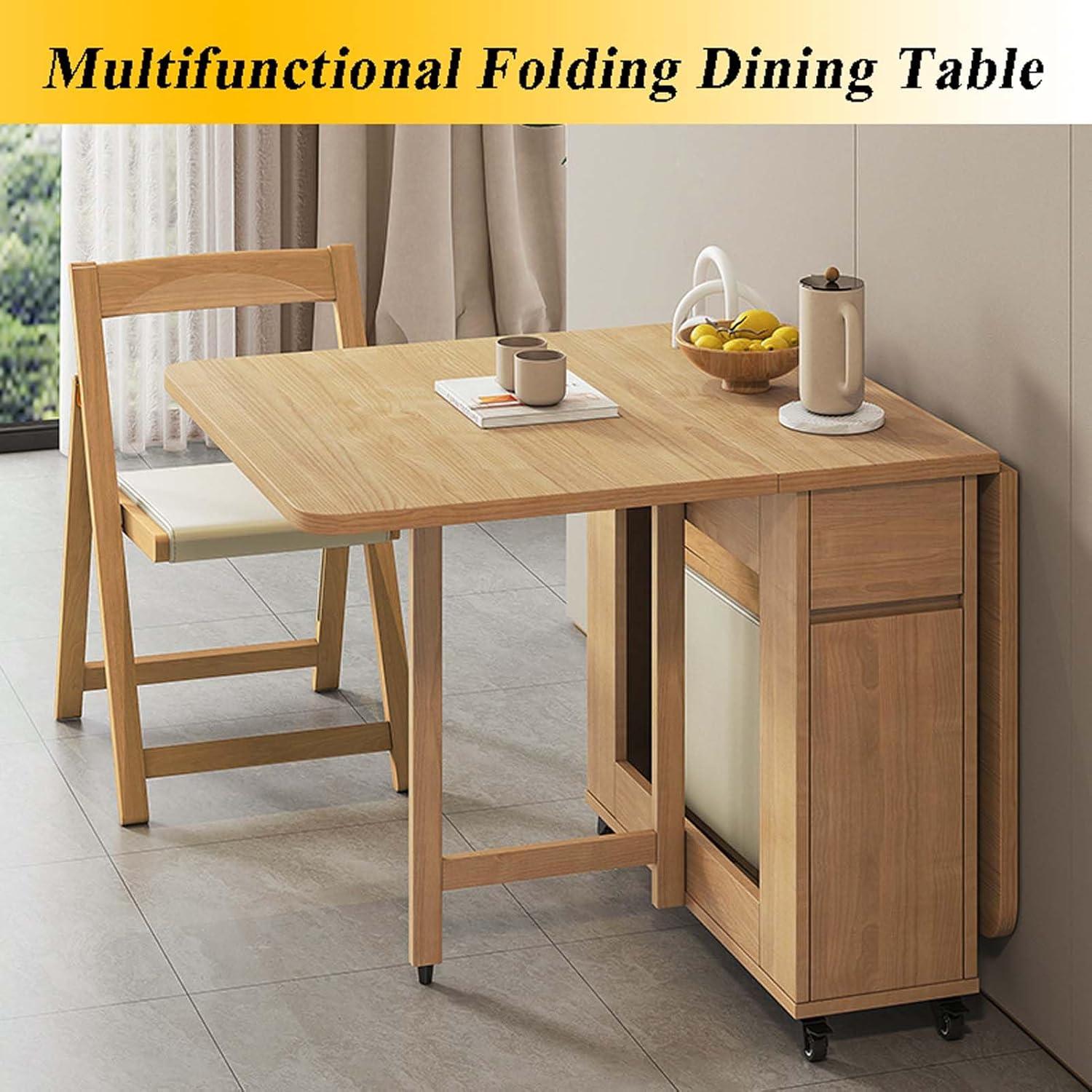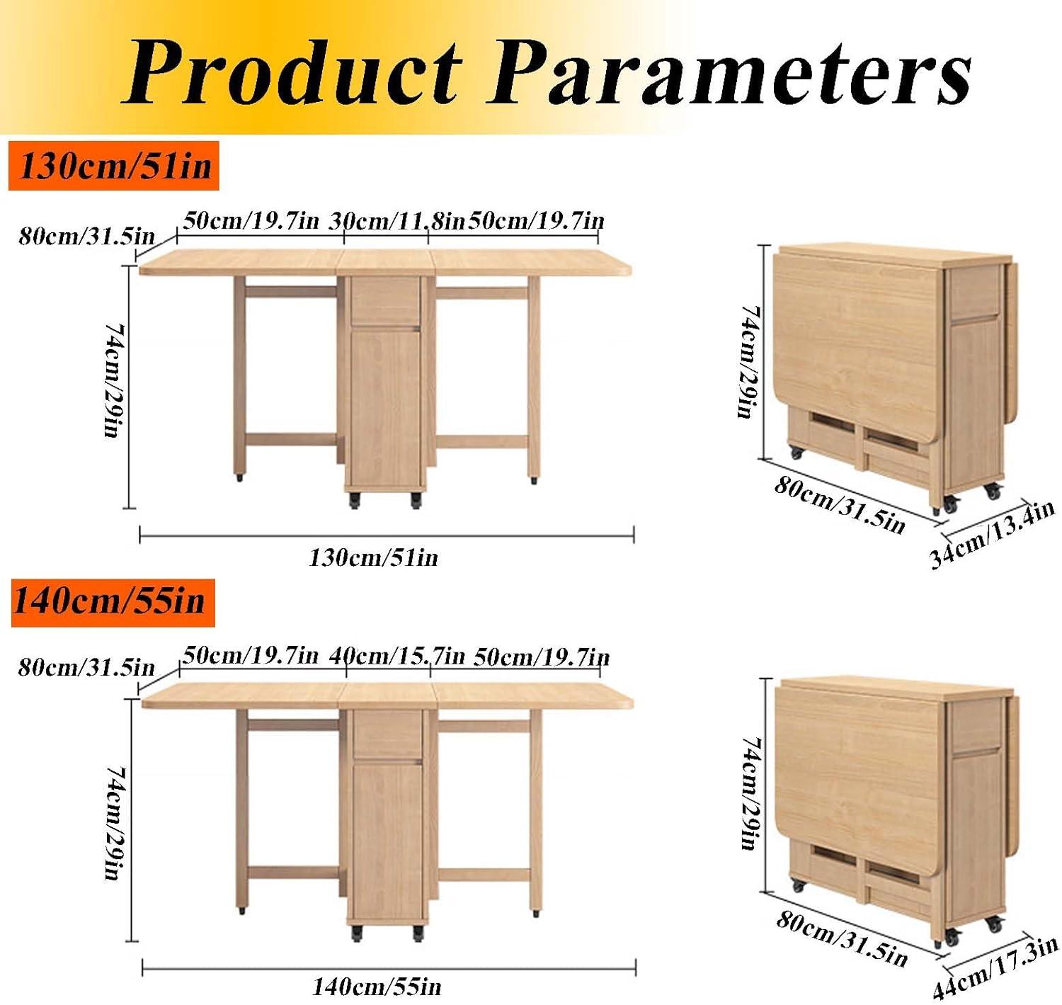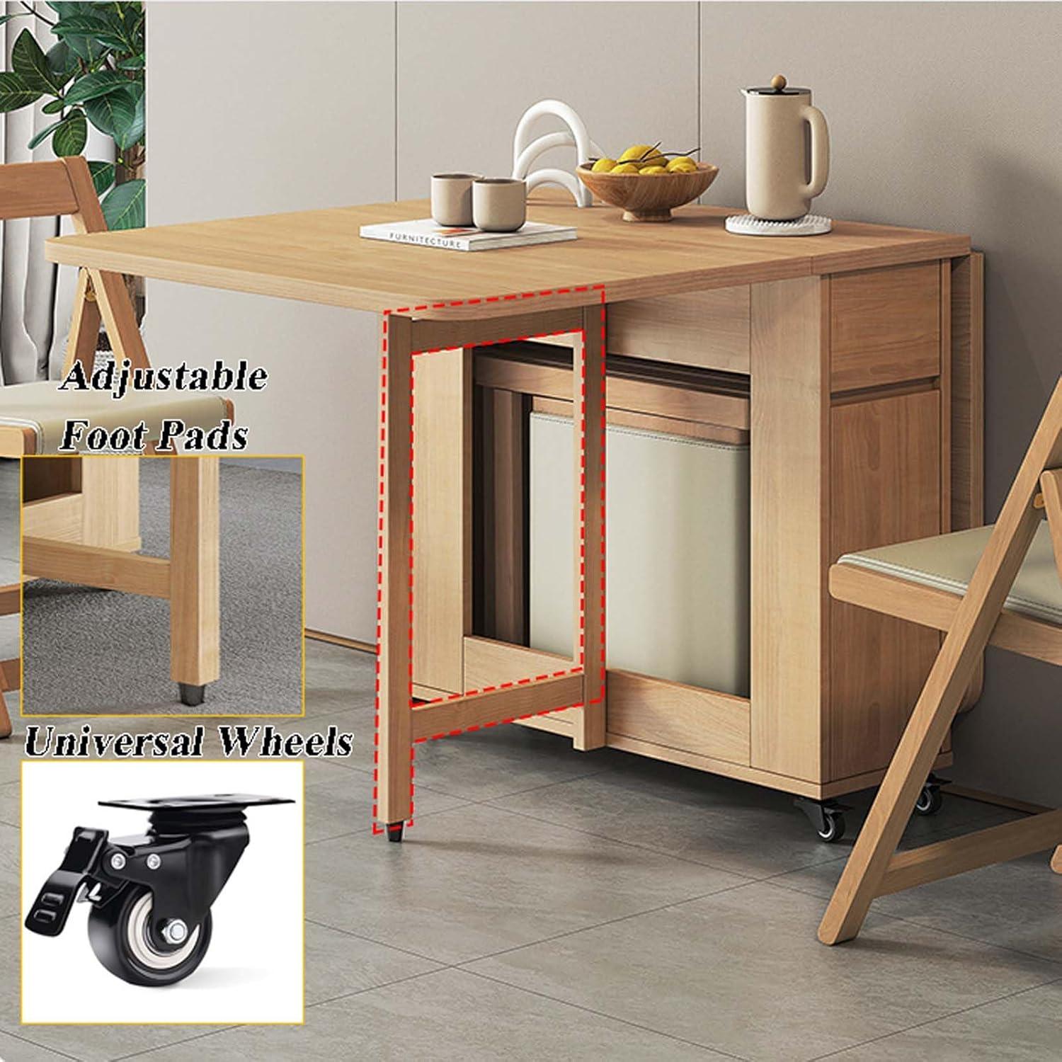 The table’s usable lengths show up plainly during setup: the model shipped as a 130 cm (about 51 in) folding top is paired with four chairs, while the slightly longer 140 cm (about 55 in) option accommodates six chairs when fully extended. In everyday use the casters and adjustable feet introduce a little give — nudging the table to one side, dialing the feet, or shifting a chair will subtly change the alignment of drawers and legs. When folded down into a console profile the top takes up noticeably less linear space, though the exact depth and clearance can vary with how the leaves settle and how tightly the drawers are pushed in.