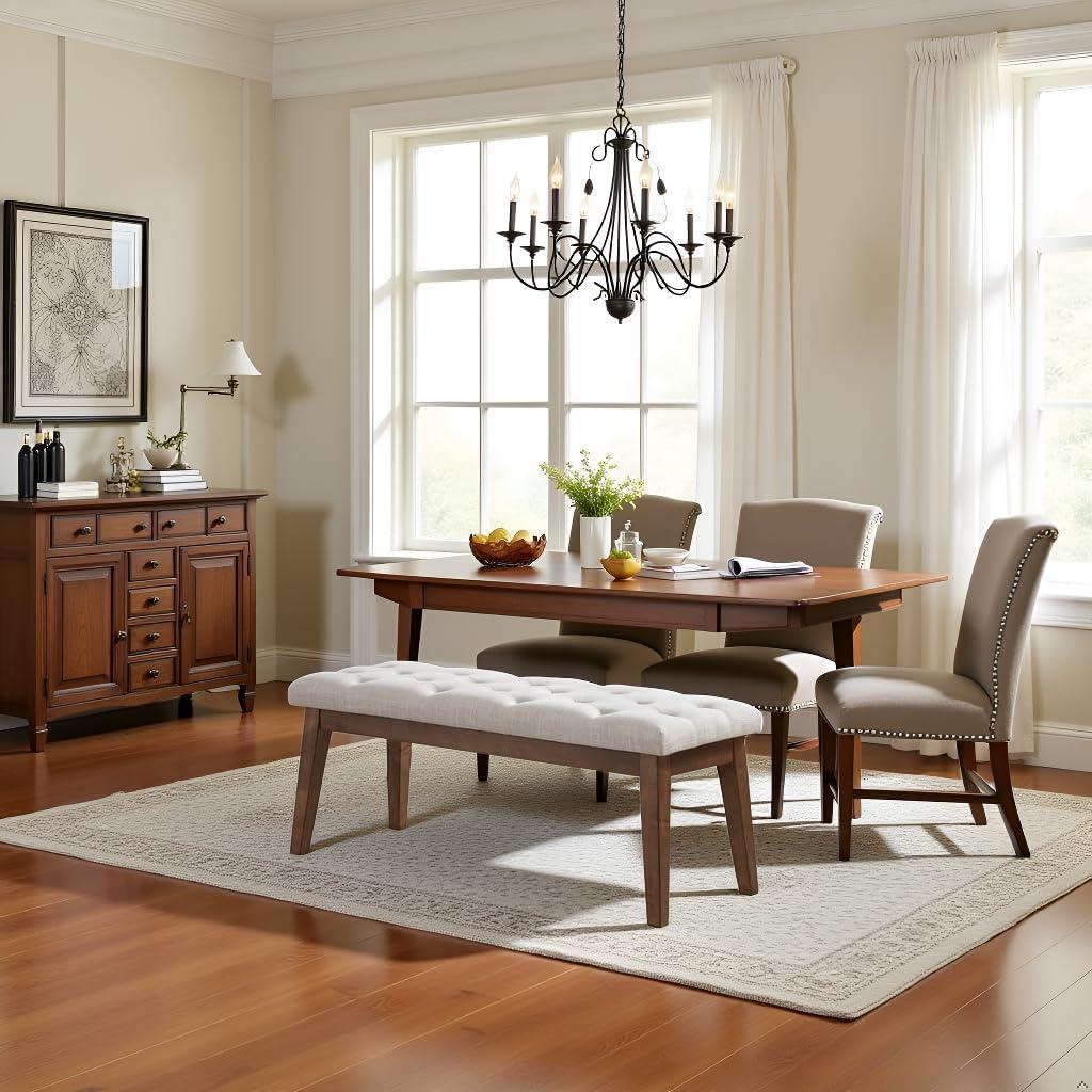 After weeks of living with it you notice how the HUIMO Bedroom Bench for End of Bed, Upholstered Dining Seat for Kitchen, Button-Tufted Ottoman Bench for Entryway and living Room (Beige) slips into the room’s rhythms rather than arriving with fanfare. In daily routines the bench finds unexpected uses — a place to fold laundry, an extra seat at the table, a pause between errands — and its comfort changes in small, familiar ways as people sit, shift, and stand. The fabric softens, light marks and scuffs appear where hands and feet meet it, and those surface traces make it feel less like a new object and more like something that settles in as the room is used.Over months it blends into everyday rhythms and stays.