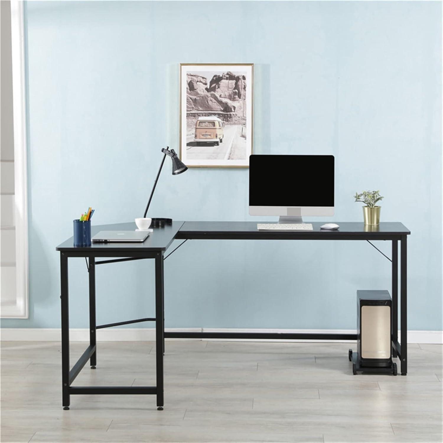 Light skimming the surface makes the desk read as a practical, grounded element in the room, its L‑shaped sweep calming rather than flashy. The listing identifies it as Desk Computer Desks’ L‑Type Staff Desk, though in the room you just call it the corner desk — familiar and unpretentious. Run your hand along the top and the finish feels smooth and slightly warm; the two-tier shelving creates a quiet vertical rhythm without cluttering the line of sight. from where you stand the frame looks visually light, but when you slide a chair under it the generous legroom and honest edges become instantly apparent, settling into the room like something that has always belonged there.