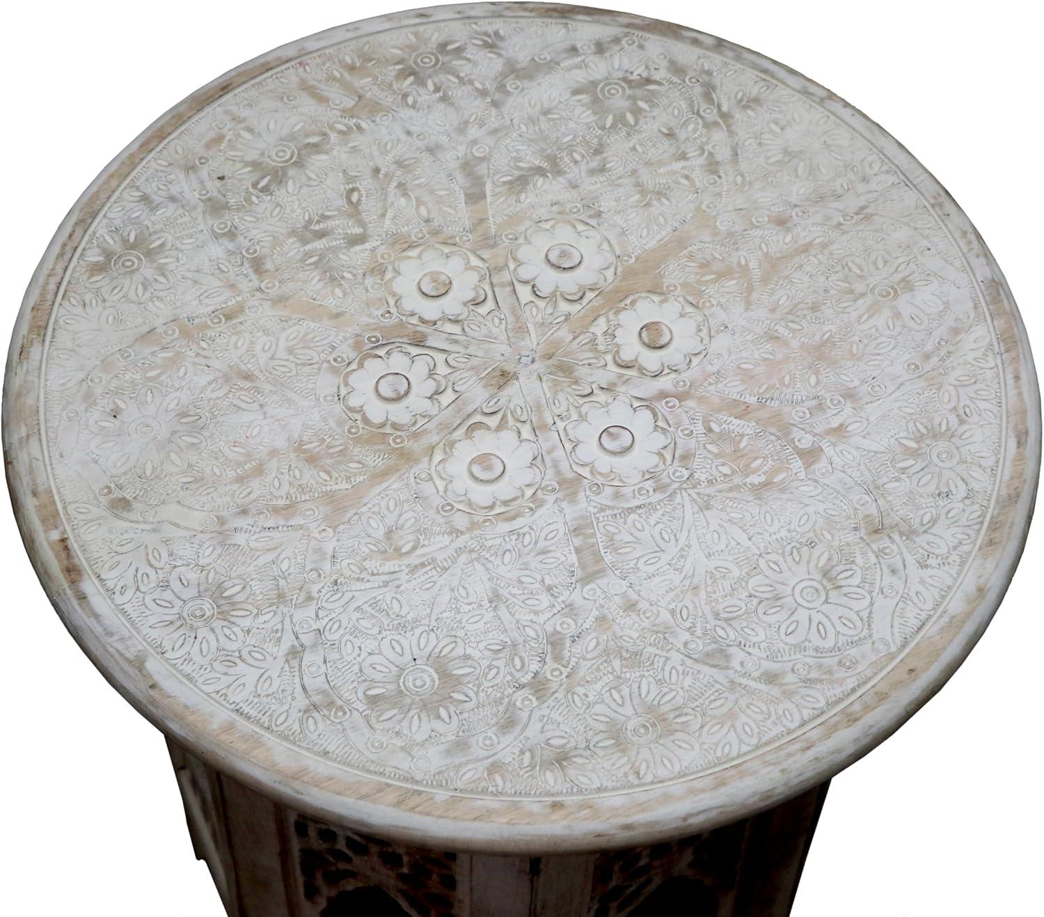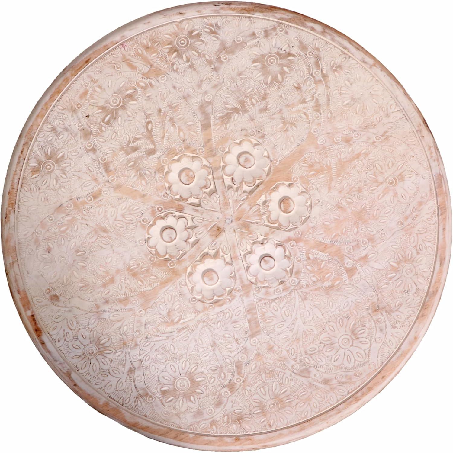 Picking the piece up or nudging it across the floor tells a similar story in weight and balance. The heft feels concentrated toward the base, so when you lift with one hand the table settles into your palm rather than wobbling. Shifting it into place often prompts the small, unconscious habits peopel have with furniture—you smooth your hand over the top to settle dust, or press lightly on the center to confirm stability—and those gestures make the tactile character more obvious: firm under pressure, slightly yielding at carved edges, and reliably textured where the artisans worked deepest. These sensations can vary a bit from one specimen to the next, as is common with hand-carved surfaces.