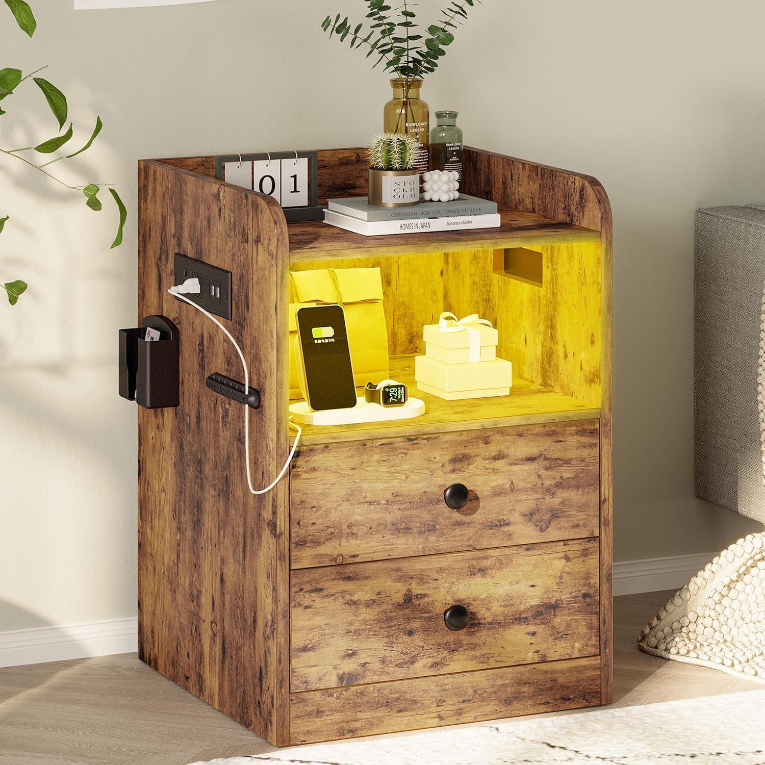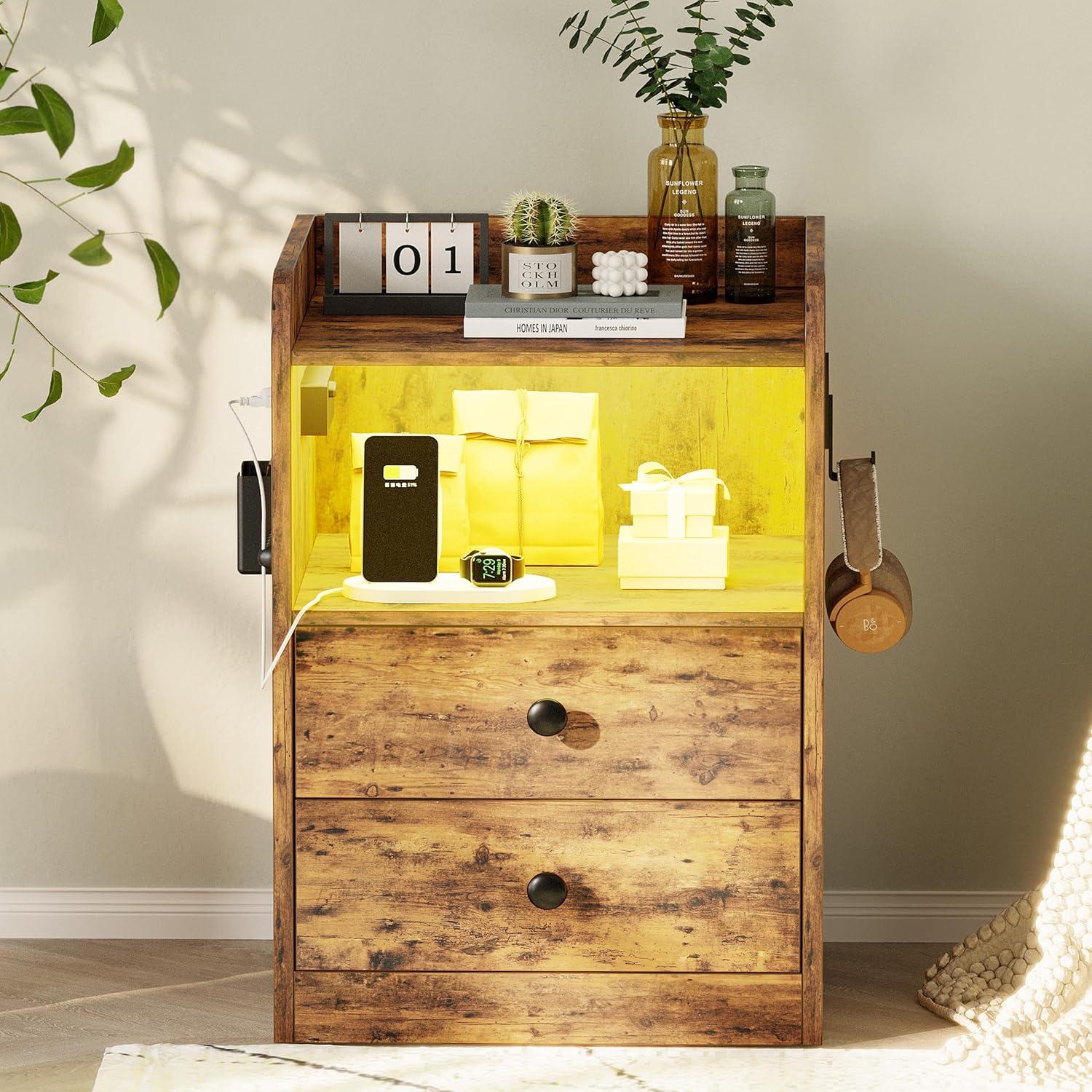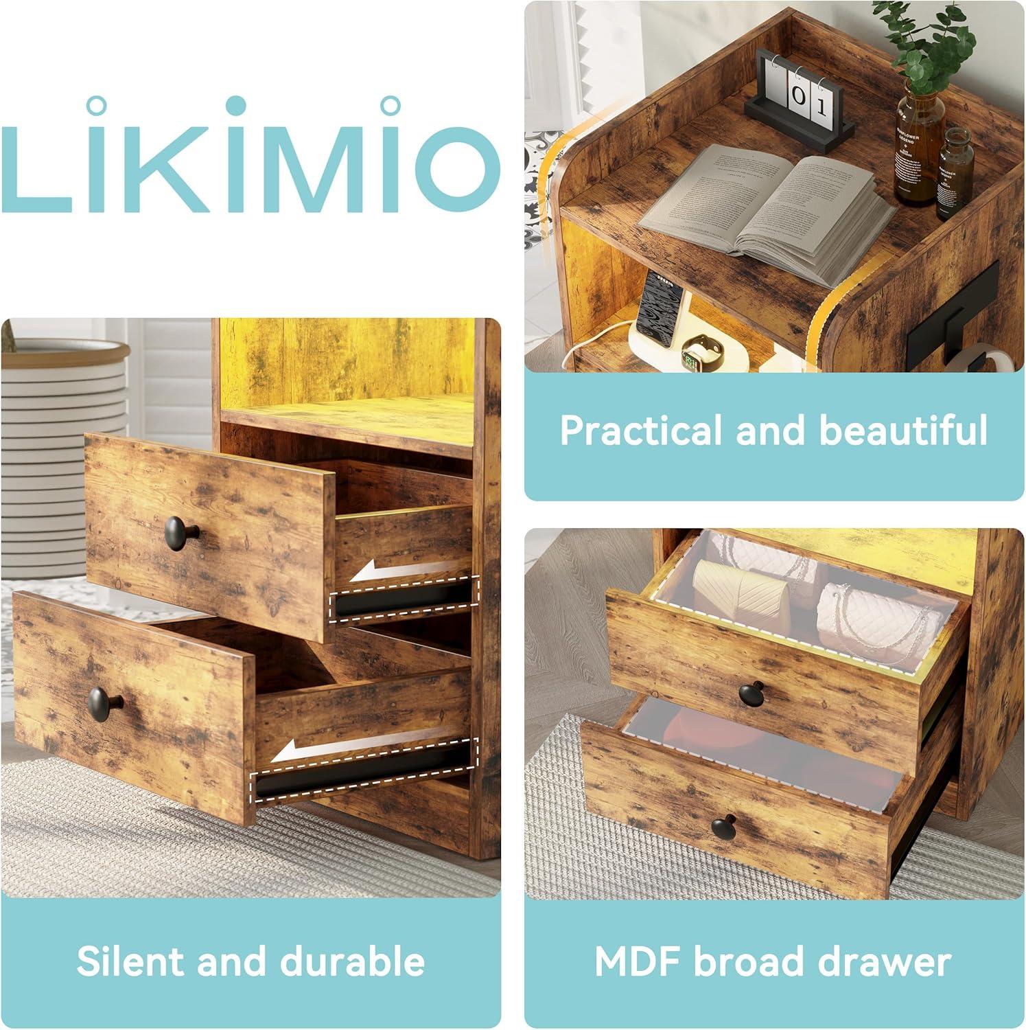 At dusk the strip of LED under the top lip is the first thing you notice, casting a low, changeable glow that softens the vintage brown finish without demanding the overhead light. About two feet tall and roughly a foot-and-a-half square, the LIKIMIO Nightstand with LED, Charging Station & USB Ports — you can just call it the LIKIMIO nightstand — reads as quietly solid: the faux-wood grain has a faint texture under your palm and the edges carry a practical little lip that keeps things from sliding off. Open shelf and two drawers tuck into its visual weight, while a side charging ledge and the cord channel make themselves known more by the tidier tabletop than by fanfare.