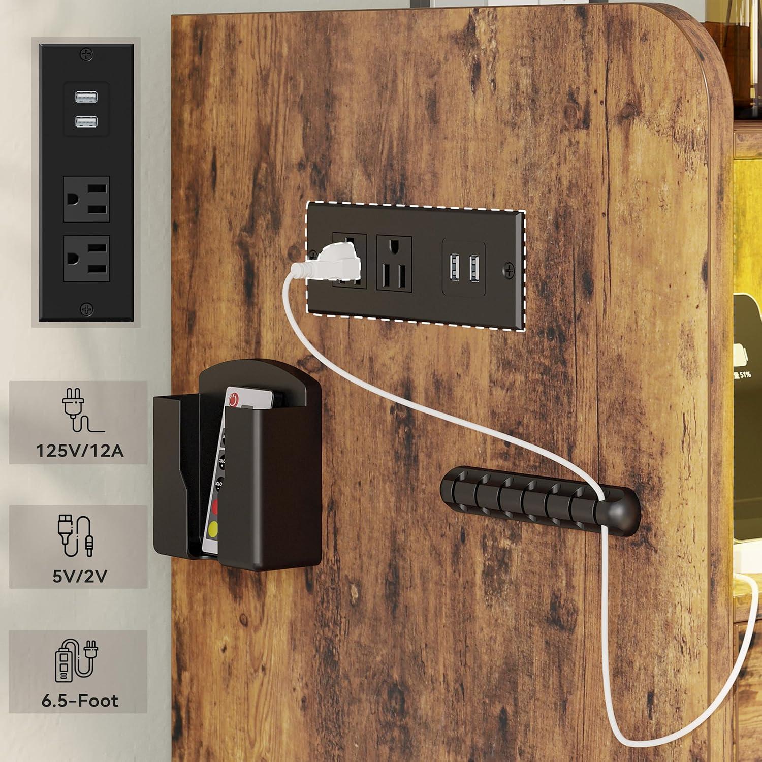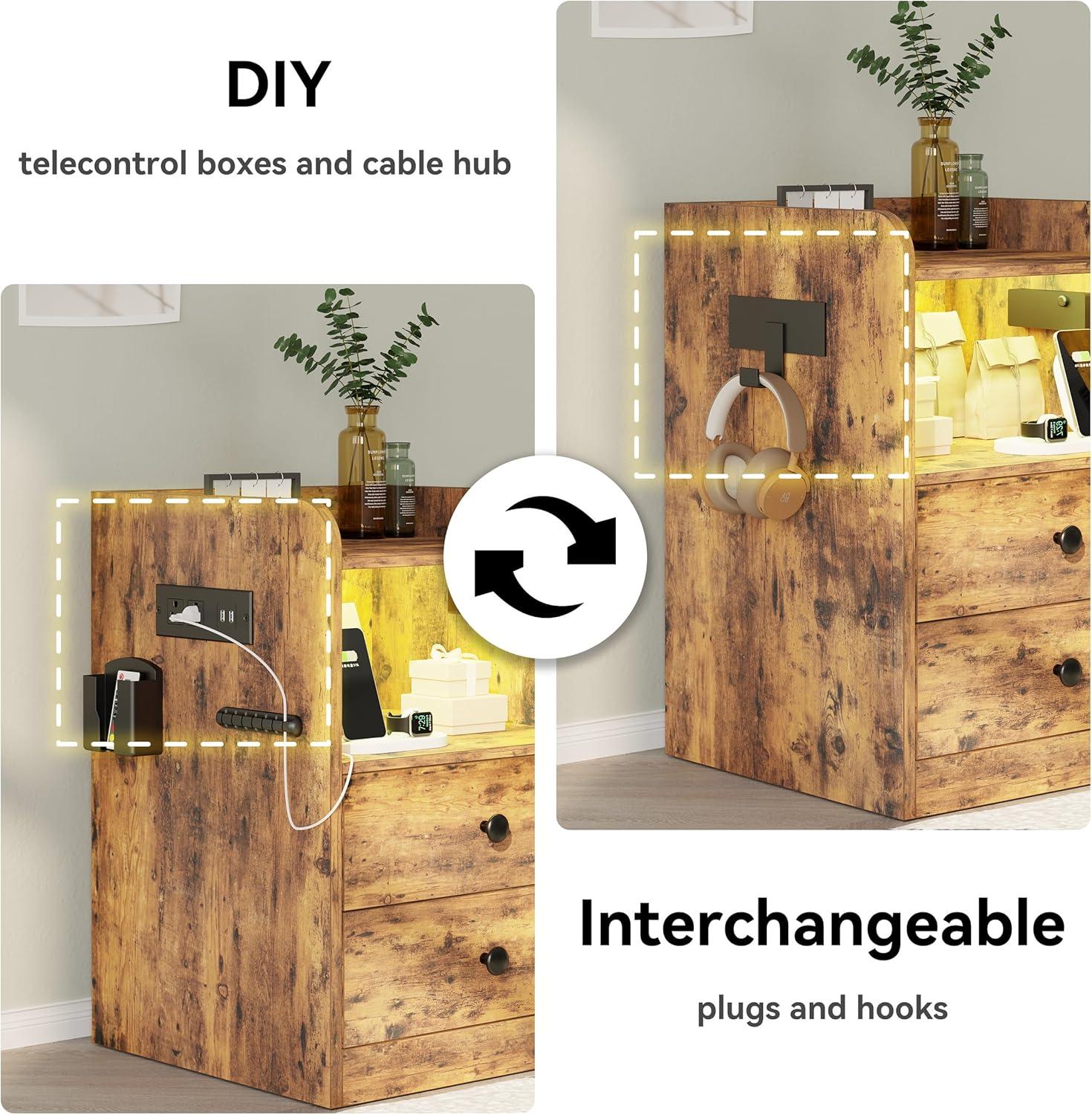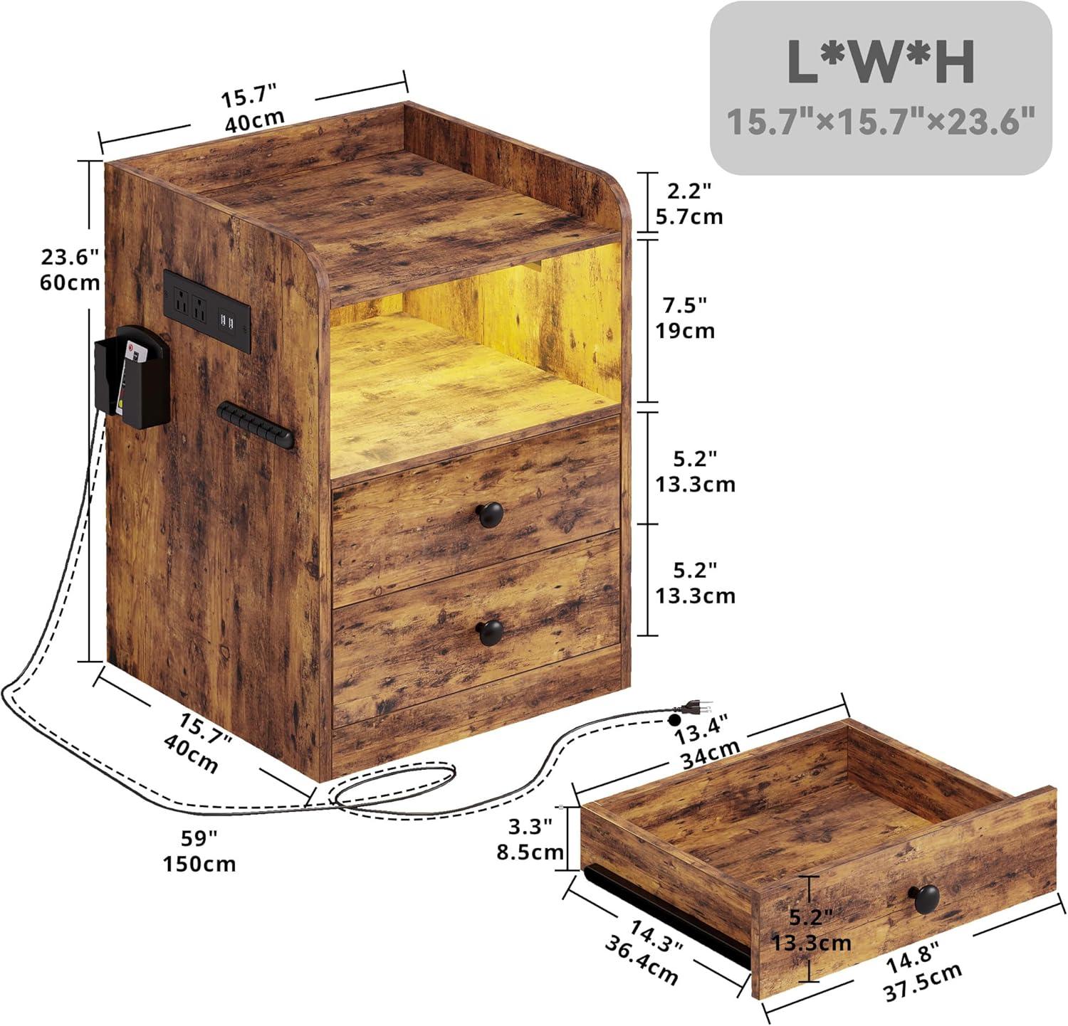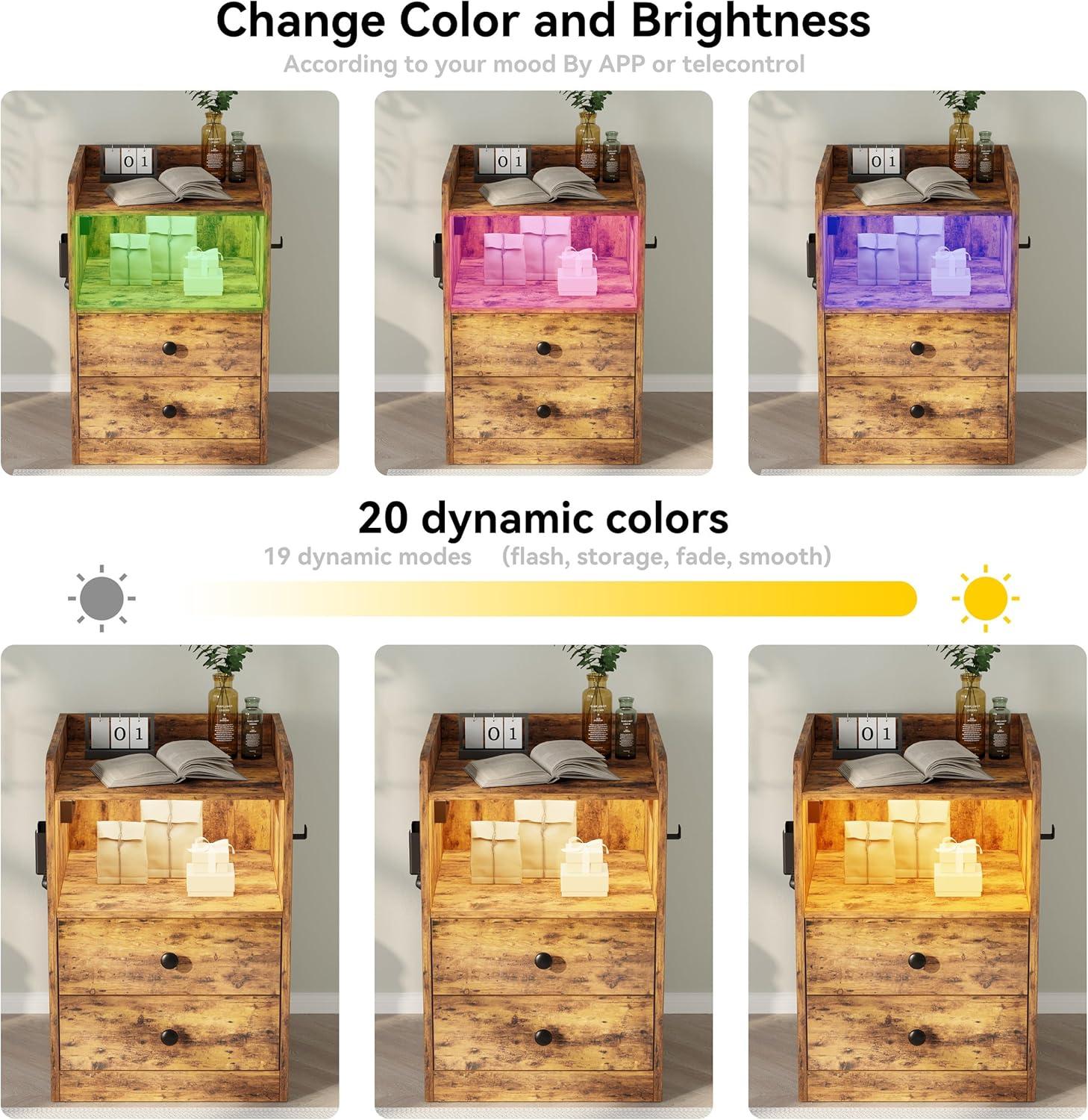 At dusk the strip of LED under the top lip is the first thing you notice, casting a low, changeable glow that softens the vintage brown finish without demanding the overhead light. About two feet tall and roughly a foot-and-a-half square, the LIKIMIO Nightstand with LED, Charging Station & USB Ports — you can just call it the LIKIMIO nightstand — reads as quietly solid: the faux-wood grain has a faint texture under your palm and the edges carry a practical little lip that keeps things from sliding off. Open shelf and two drawers tuck into its visual weight, while a side charging ledge and the cord channel make themselves known more by the tidier tabletop than by fanfare.