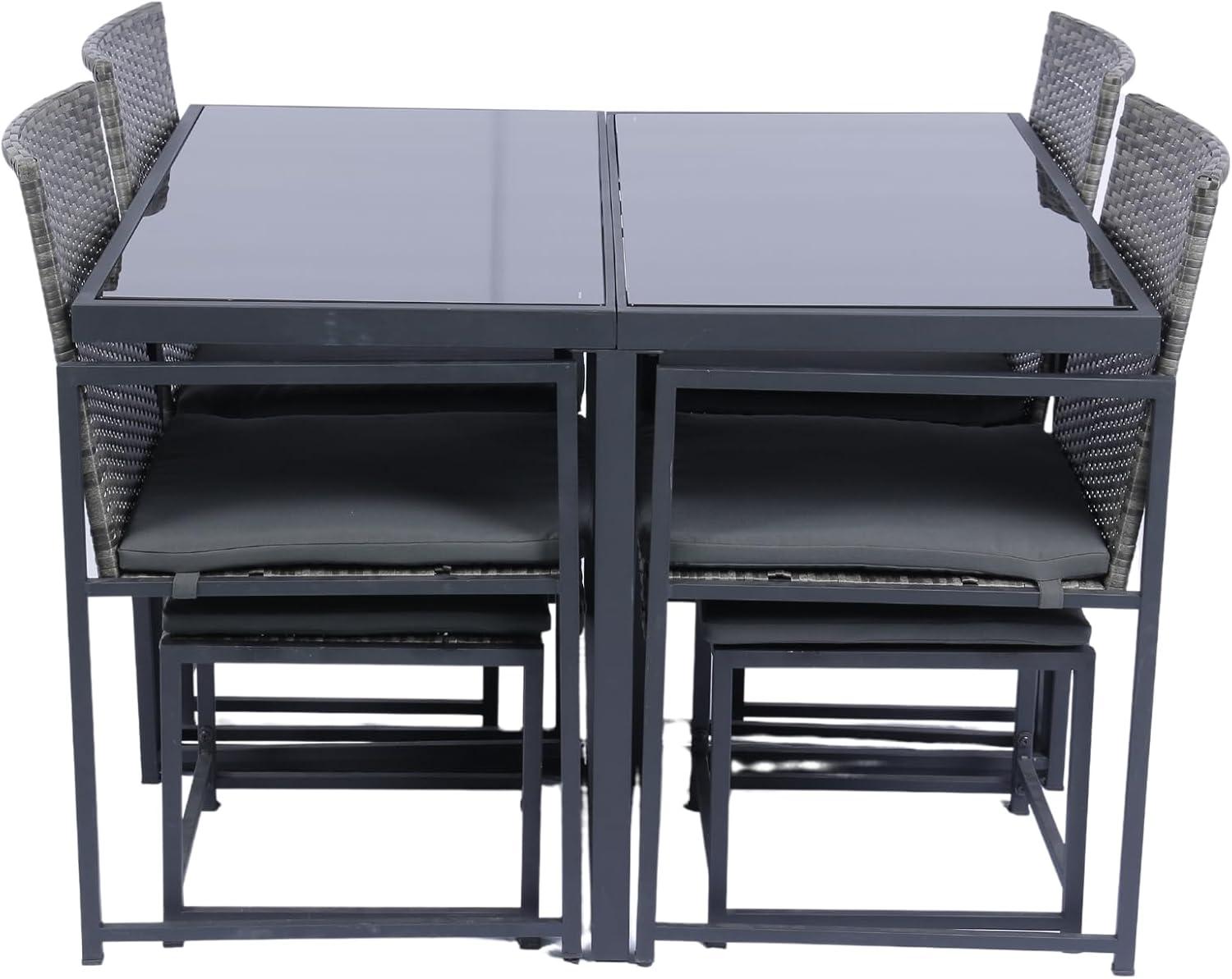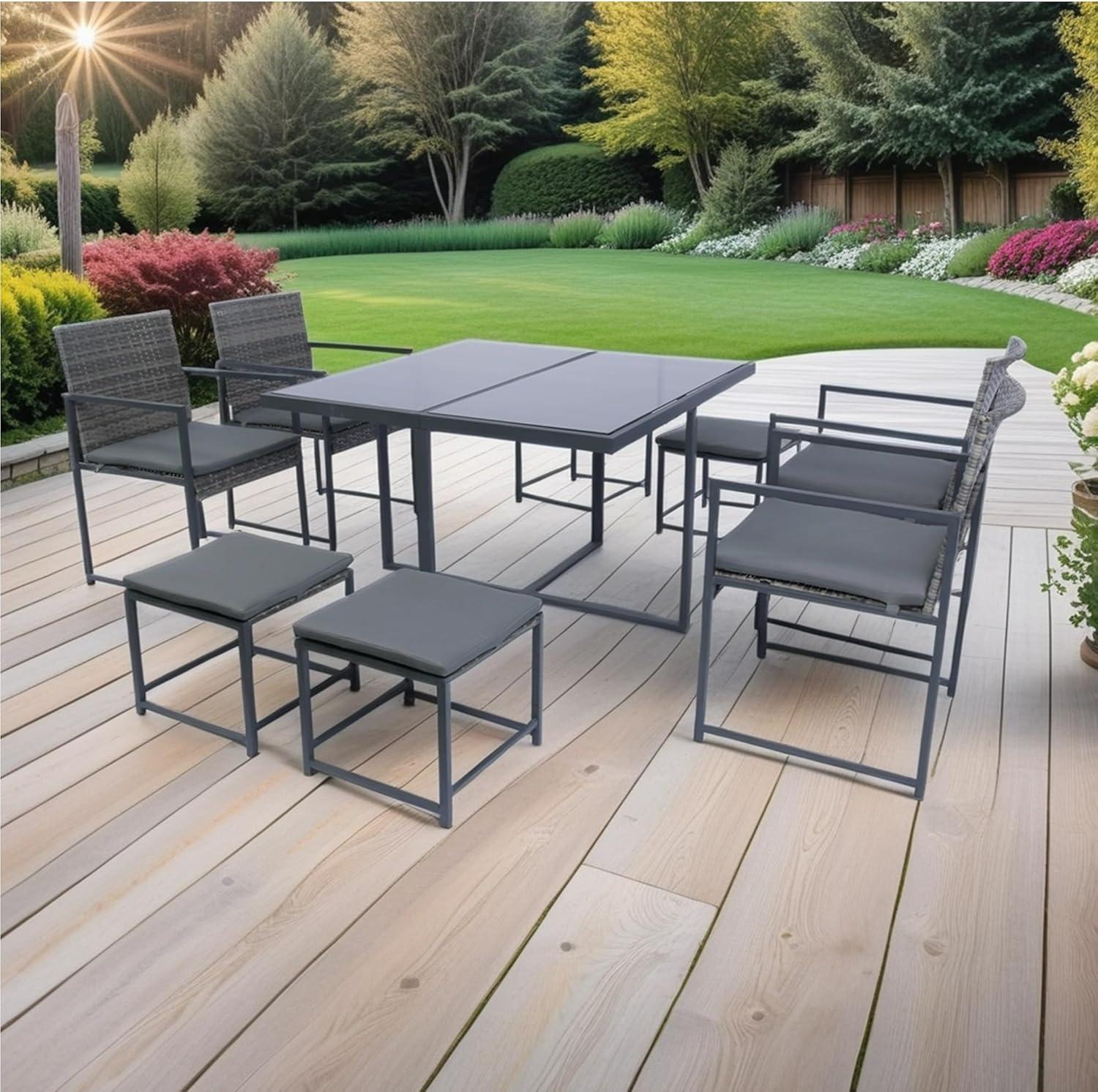 We love how this set effortlessly balances style and function, making it a standout addition to any garden, poolside, or backyard. The hand-woven PE rattan wrapped around each piece gives a timeless, sophisticated look that complements various outdoor themes, from modern minimalism to rustic charm.The understated grey cushions not only enhance comfort but also bring a subtle elegance that enriches the overall ambiance. What truly impresses us is the space-saving design – every armchair and single chair tucks neatly under the table, making the entire set remarkably compact when not in use. This thoughtful feature helps maintain a clutter-free outdoor environment without sacrificing seating capacity.