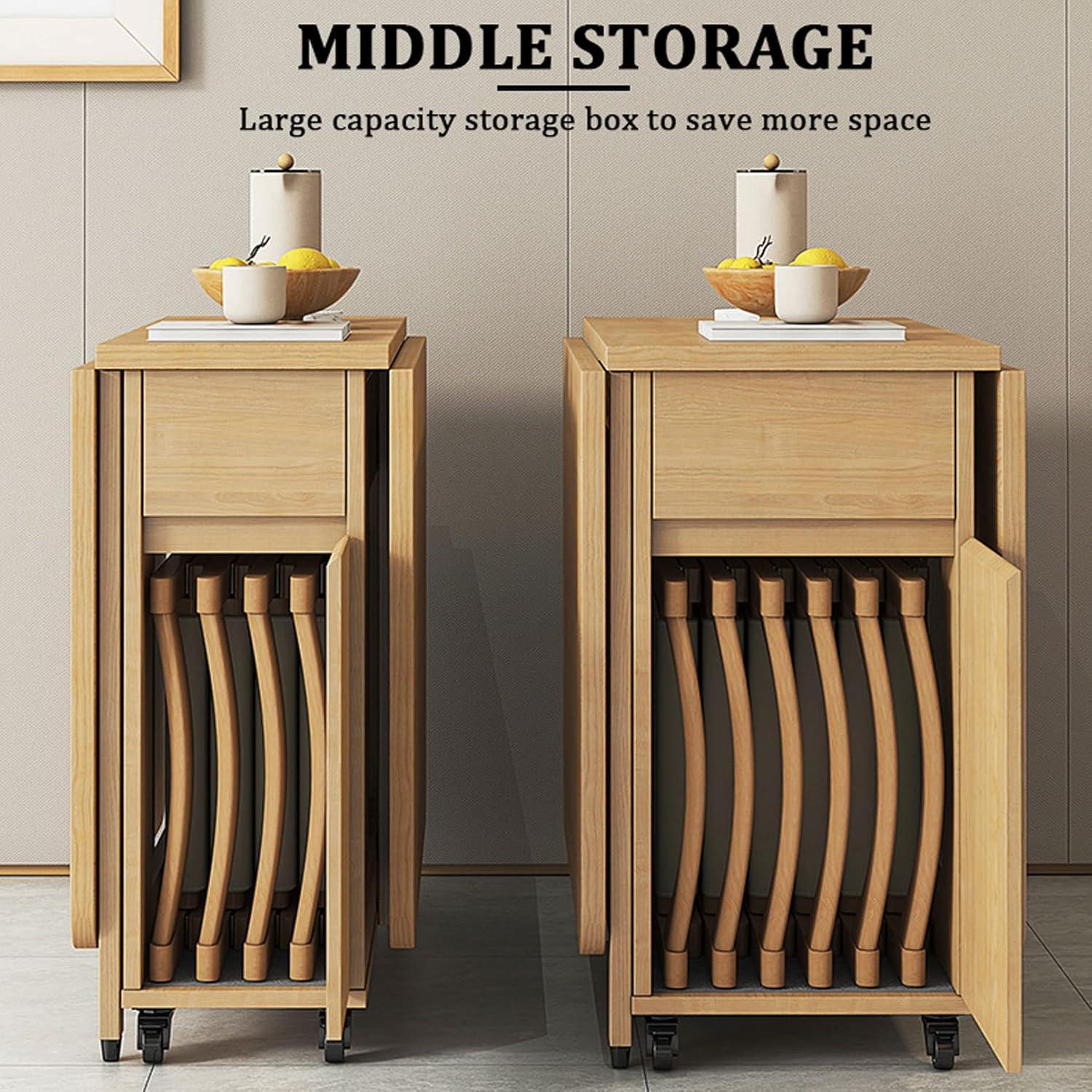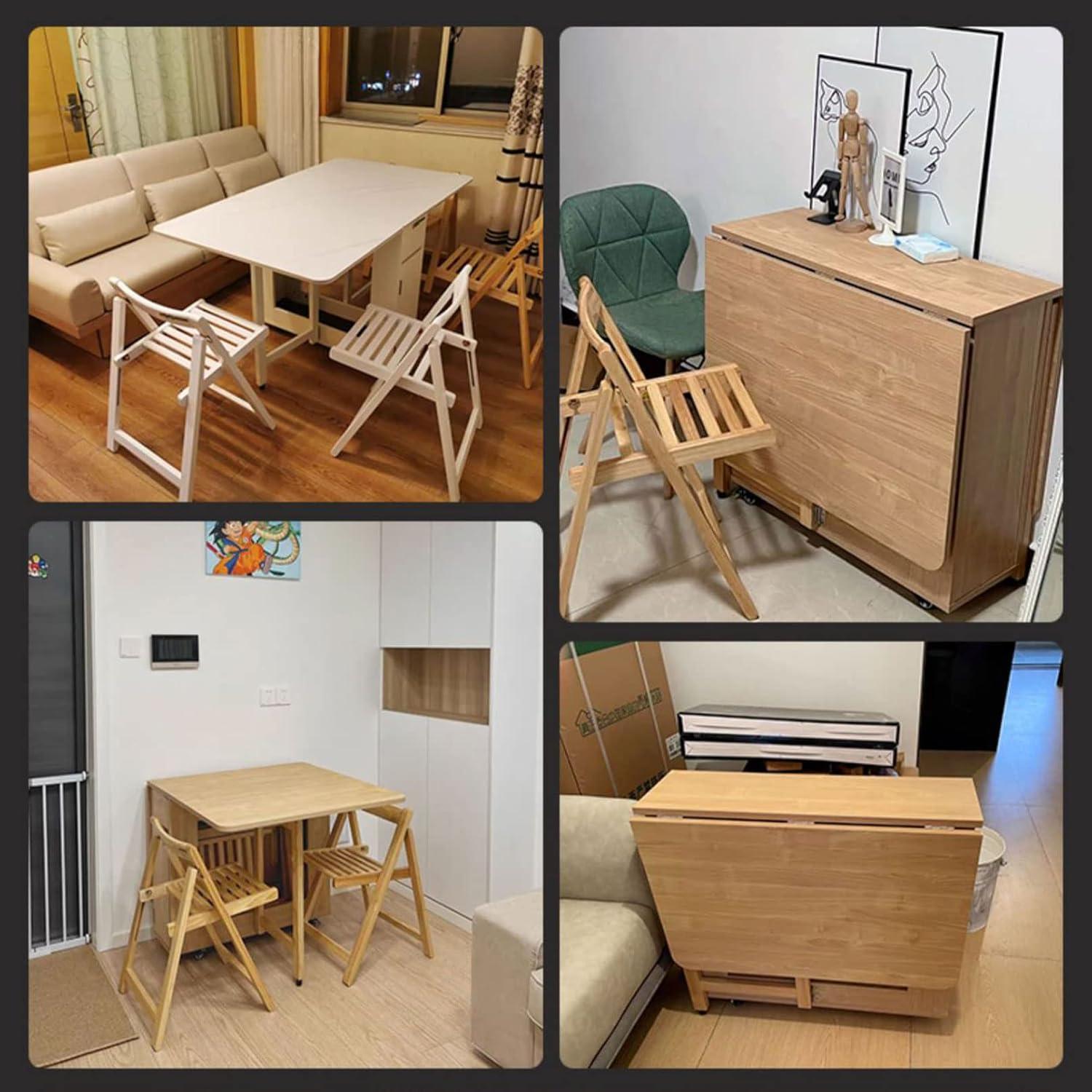 The foldable design is ingeniously engineered with three distinct modes, allowing us to effortlessly transform the dining area to adapt to our needs. The lift-up table tops provide valuable extra space, perfect for hosting guests or expanding meal prep.Each chair folds neatly and fits securely within the table structure, optimizing space-saving without sacrificing comfort. rubber shock absorbers add a cushioned feel when moving the furniture, reducing noise and protecting floors. assembly was straightforward thanks to clear instructions, and the quality finishes make cleaning quick and hassle-free.