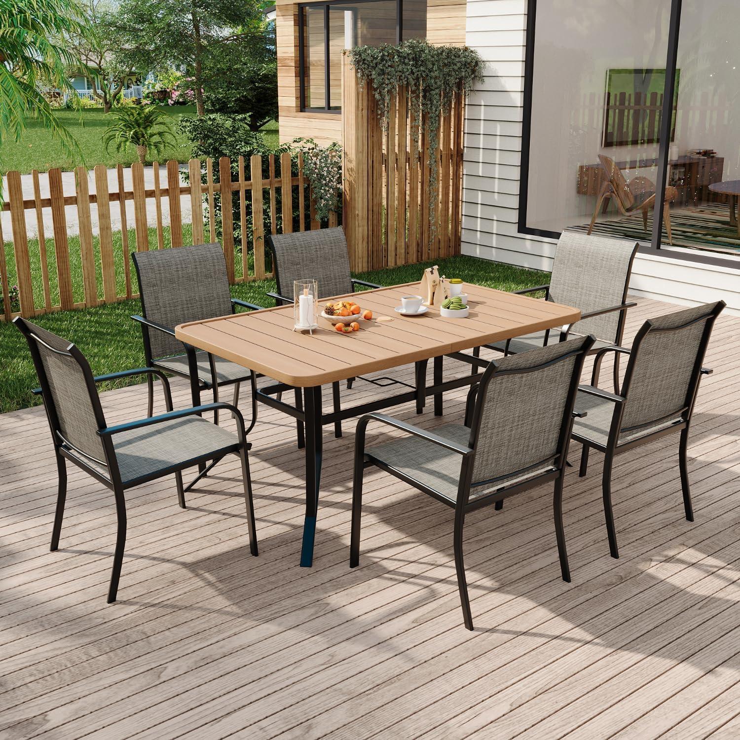 After a few weeks you notice how the MELLCOM 7 Pcs Patio Dining Set with Metal Table and 6 Textilene Chairs for Backyard, Garden, Deck and Poolside sits quietly on the deck, no longer new but gradually woven into the pattern of morning coffee and late-afternoon chats. Over time you watch the chairs settle into familiar postures, the table surface gathering faint marks from cups and hands, and the set quietly reshaping where you place plants or slide out a chair. In regular household rhythms it becomes less of an object to examine and more a part of the day — a place where your laptop opens, where a cold glass rests, where conversation starts and peters out. It stays.