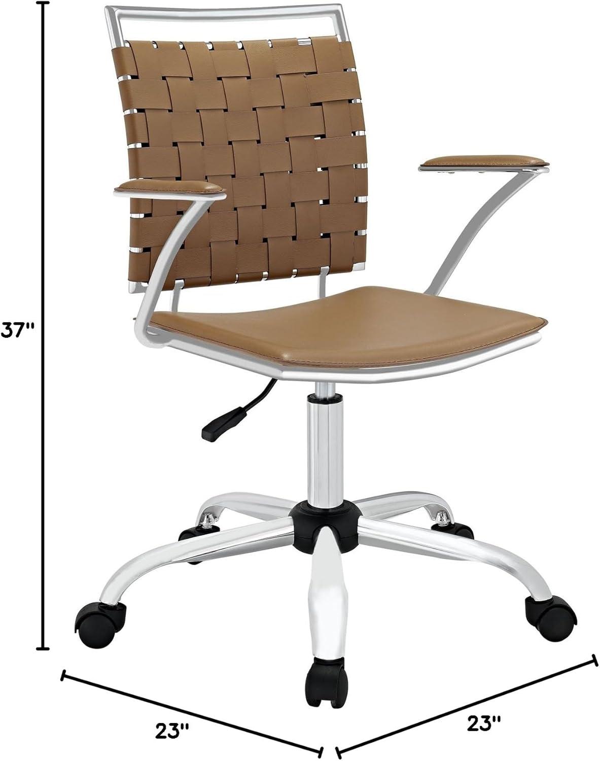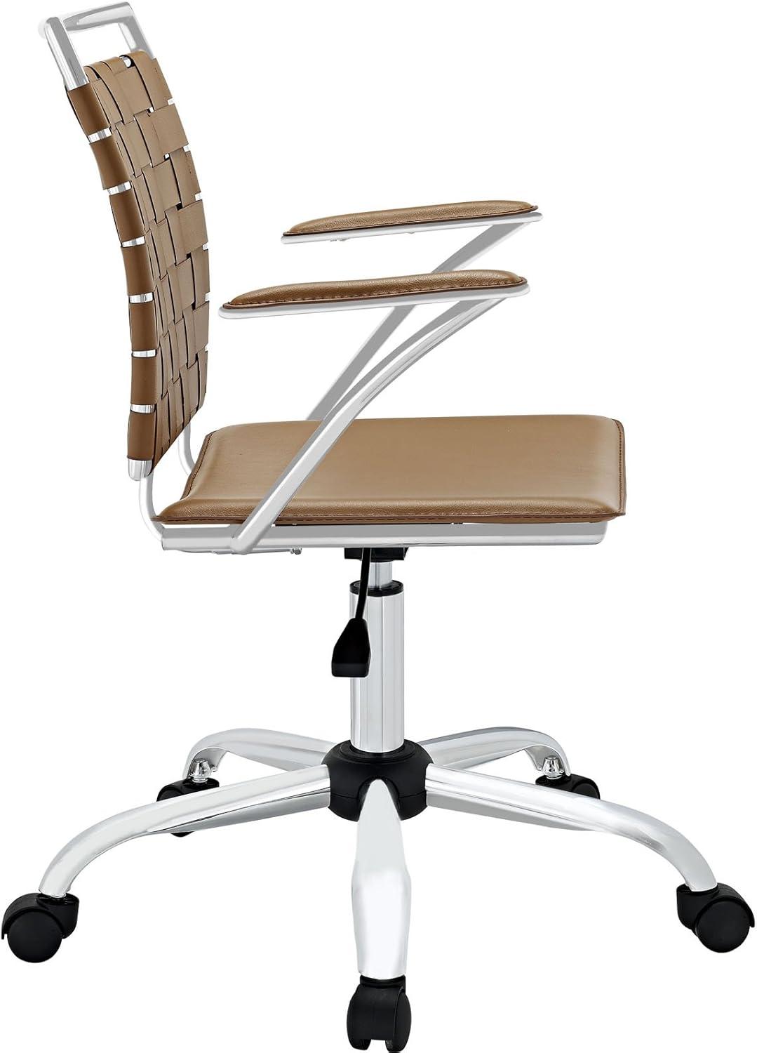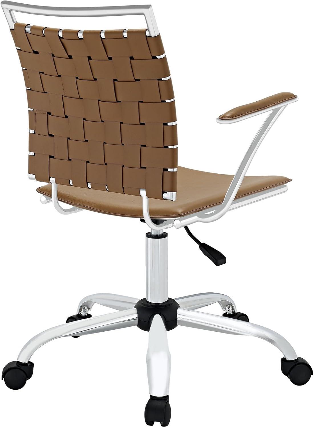 Light skims the tan seat and chrome-plated ​base, and from across the room the chair reads a touch lighter than ⁤its dimensions ​suggest. You press a thumb ‌into the PVC-covered cushion ‍and feel ‍a modest ​give, then ​trail a hand ⁣along the webbed back where the ‌weave flexes beneath your ‍palm. The​ angled armrests and low, ⁤compact silhouette ​settle into the⁤ corner with an unassuming,⁣ slightly edgy⁢ profile, and the casters move with a quiet, carpet-friendly shuffle. Modway Fuse (EEI-1109)⁤ sits there more like a workaday companion than ‍a ‍centerpiece.