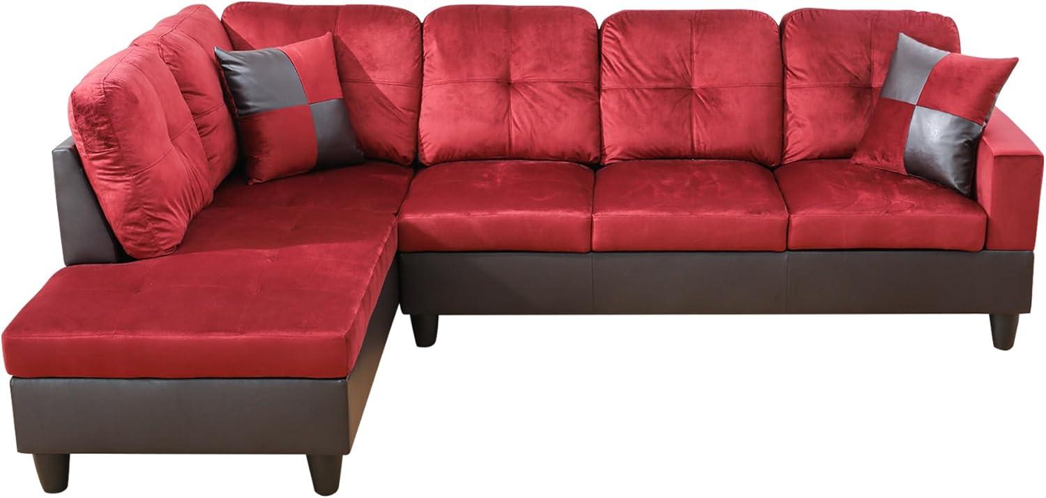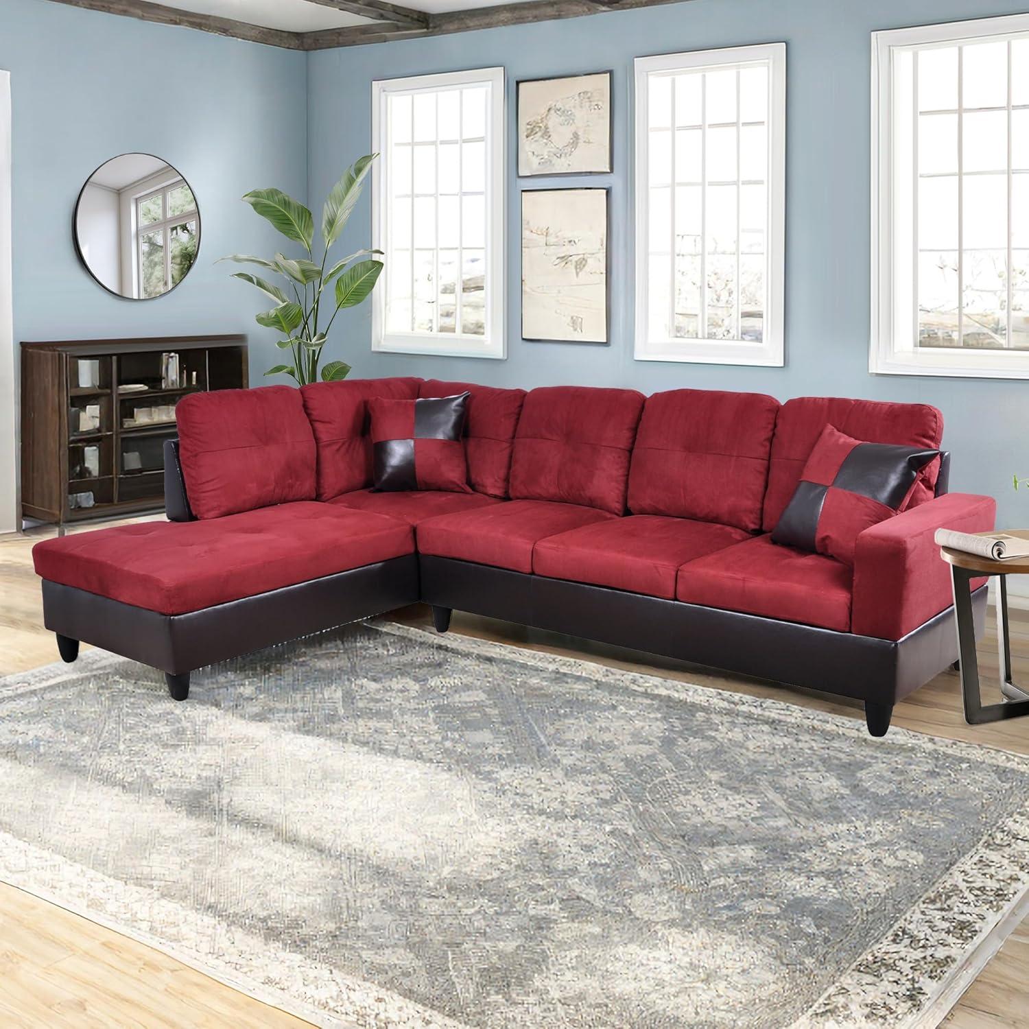 When you step into the living room the sectional immediately anchors the space with a strong red sweep against the black base; the two tones catch light differently, so the red panels can read brighter near a window and a touch deeper under lamplight.From a few paces away the L-shaped silhouette looks compact and purposeful, the chaise projecting into the room and creating a clear path you naturally trace with your feet. Up close, seams and stitching become part of the visual rhythm — you might run a hand along a cushion and notice the fabric gives a little, then settles, leaving faint creases were your palm passed.