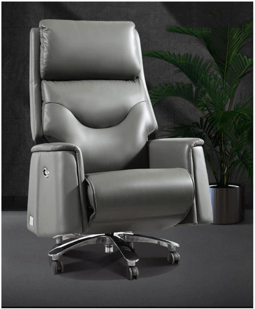 Light catches on the cowhide panels as you lower yourself into the chair—its broad silhouette takes up more of the room than you expected. You notice the Office chairs Electric Massage Boss Chair and, in your head, shorten it to “cowhide recliner”; up close the leather feels dense and slightly grainy under your palm while the seat gives with a firm, high-resilience bounce. A telescoping footrest slides out smoothly and the aluminum-alloy feet sit cool against the rug; when you press the button a low, even hum reveals nine small massage nodes rippling beneath the padding. The recline tilts back without drama and the whole piece keeps a visual weight that quietly reshapes the corner were it lives.