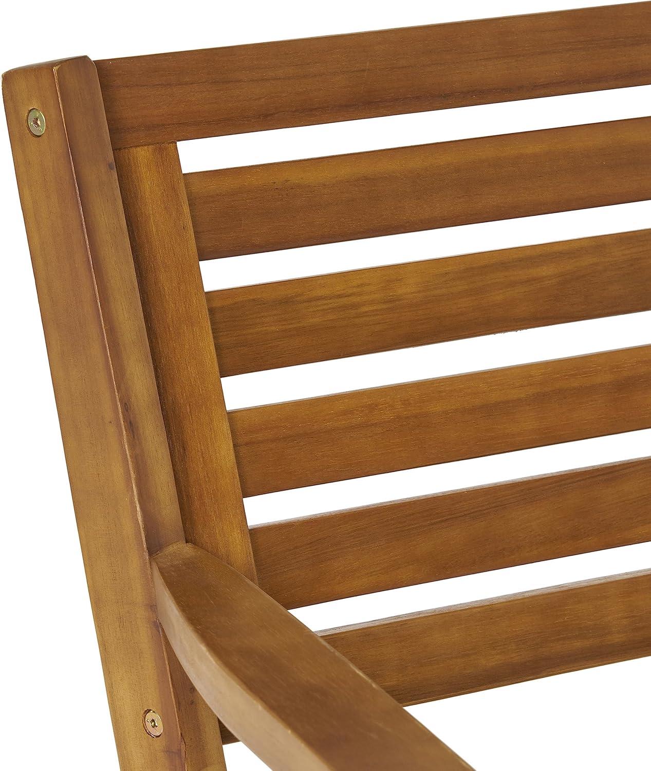 Peering under and between pieces brings the joinery into focus. You’ll see dowels and recessed fasteners sitting close to the surface, and some corners show tiny glue lines tucked into seams. When you shift a chair or brace the table with your weight there’s a short, settling flex at a few junctions; the parts tend to bed in after repeated use and the occasional audible creak can appear during the first handful of movements. The connecting hardware is visible where the frame meets the slats—flat-headed screws, small brackets and washers that sit flush or just shy of flush depending on the cut of the wood.
