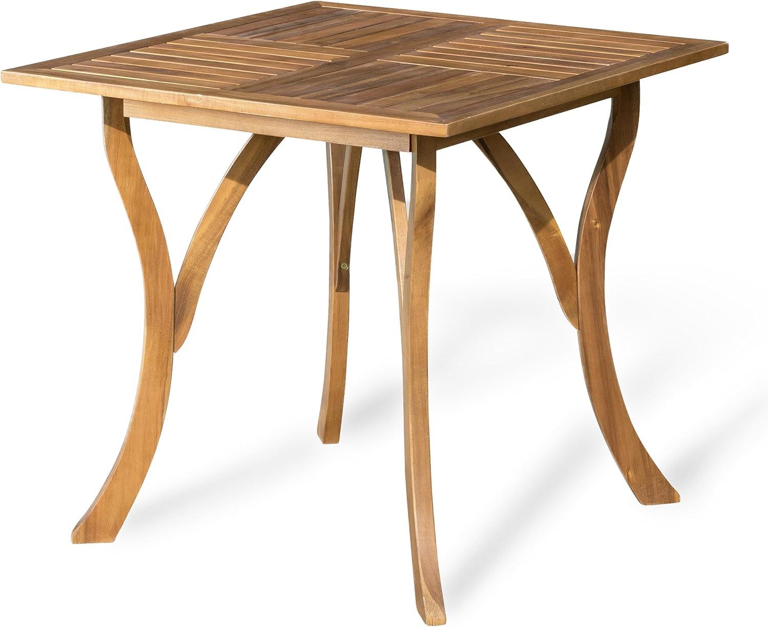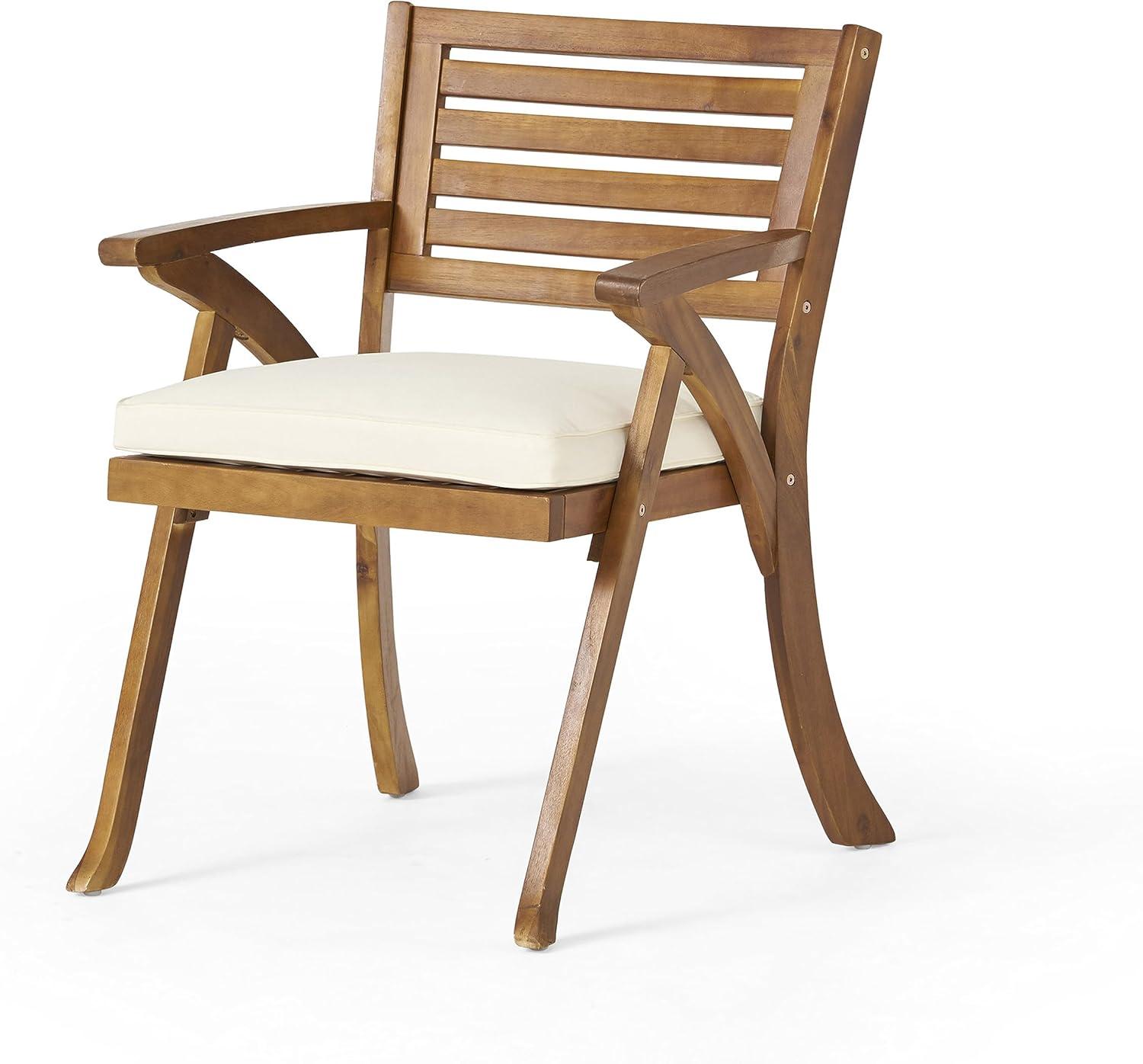 Over time you notice how the Outdoor 5 Piece Wood Dining Set with Cushions, Teak Finish, Includes 4 chairs and Table from Harbor & Oak settles into the yard in small, quiet ways as cushions soften and the wood finds a neutral rhythm with sun and rain. In daily routines you see the chairs shift toward familiar spots, feel the cushions give a little more where someone always sits, and watch the tabletop take on the gentle, ordinary marks of meals and projects. As the room is used, it becomes part of coming-and-going — a pause between errands, a surface for plates and papers, a steady presence in regular household rhythms. After a while it simply stays.
