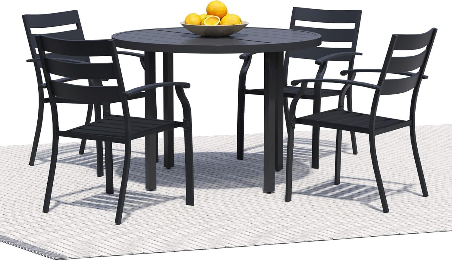 Our patio’s conversion began⁢ the moment we introduced this sleek‍ 5-piece dining set. The modern black finish of the round table paired with​ its clean, slatted surface lends ⁣a minimalist yet sophisticated touch that effortlessly complements any outdoor decor. The adjustable umbrella ⁢hole is a thoughtful feature that not only adds a layer of⁤ UV protection but also enhances the table’s functionality without ⁣sacrificing style. Surrounded by the slim, powder-coated metal chairs, the entire setup offers a cohesive look that ties together natural elements of our lawn ⁤and garden​ while maintaining a⁤ contemporary vibe.