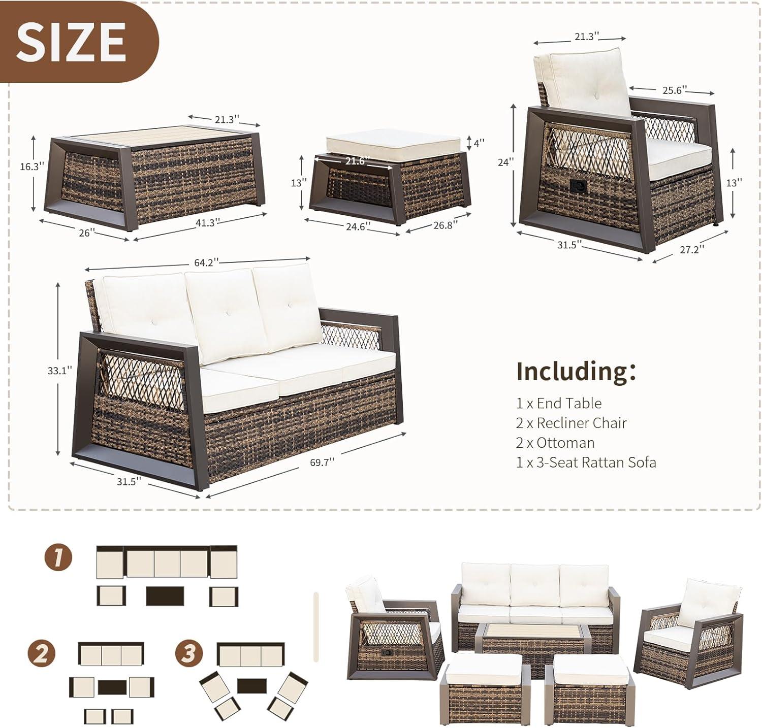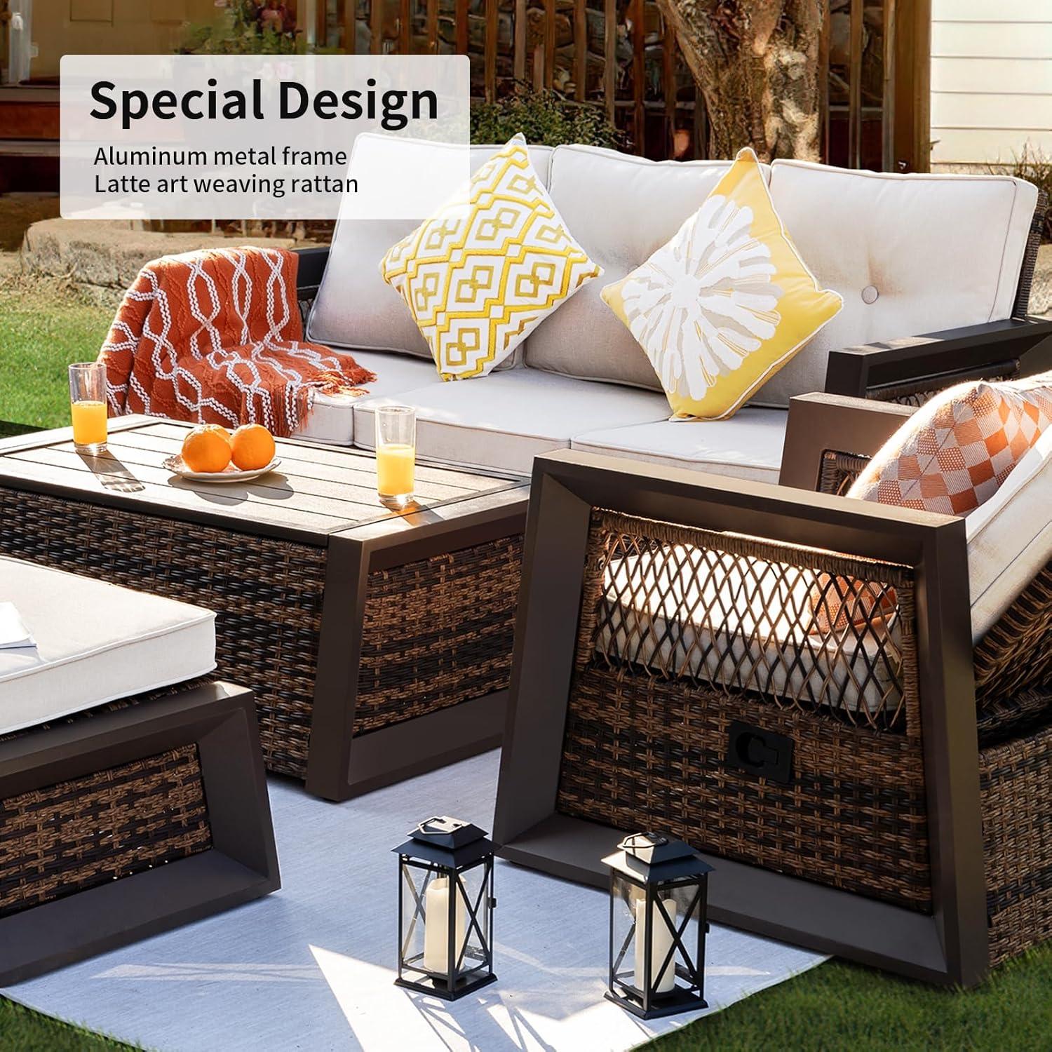 FOOWIN 7-Piece Patio Furniture Set, HDPE All-Weather Outdoor Conversation Set with Thick Cushions, Sectional Patio Sofa Furniture for Deck, Porch, Lawn, Garden, Brown Frame & White Cushion