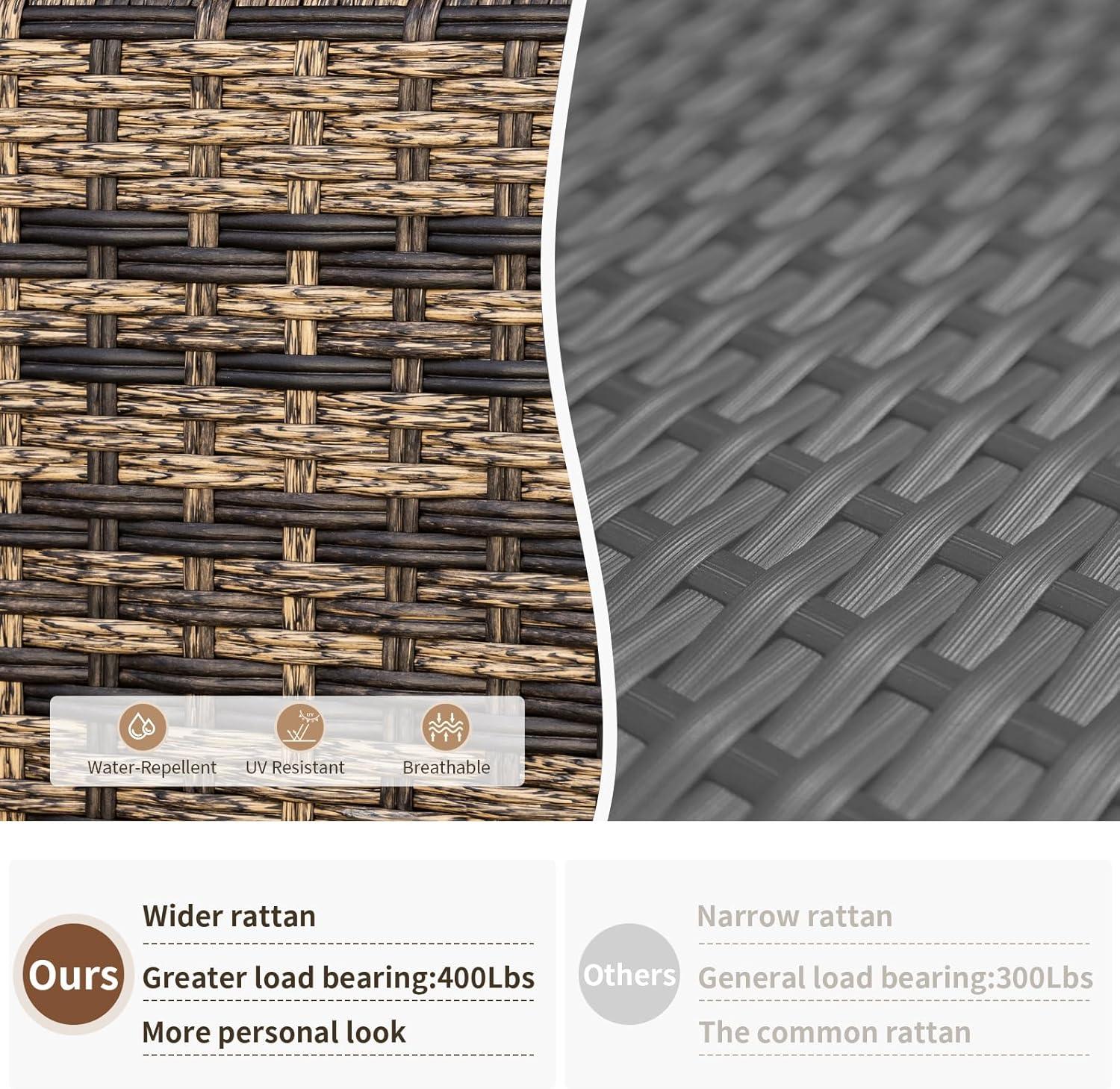 • Durability and Weather Resistance: Made from durable PE rattan wicker and a high-quality steel frame, the furniture set is built for stability and balance. The All-Weather wicker and Anti-Rust steel frame ensure the set's durability, while the breathable 250G polyester fabric is Anti-UV, water repellent, and resistant to stains.