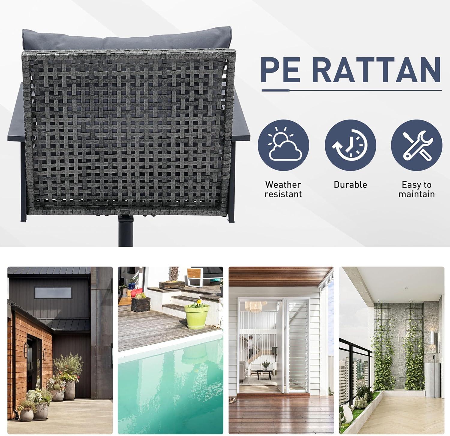 • Durability and Weather Resistance: Made from durable PE rattan wicker and a high-quality steel frame, the furniture set is built for stability and balance. The All-Weather wicker and Anti-Rust steel frame ensure the set's durability, while the breathable 250G polyester fabric is Anti-UV, water repellent, and resistant to stains.