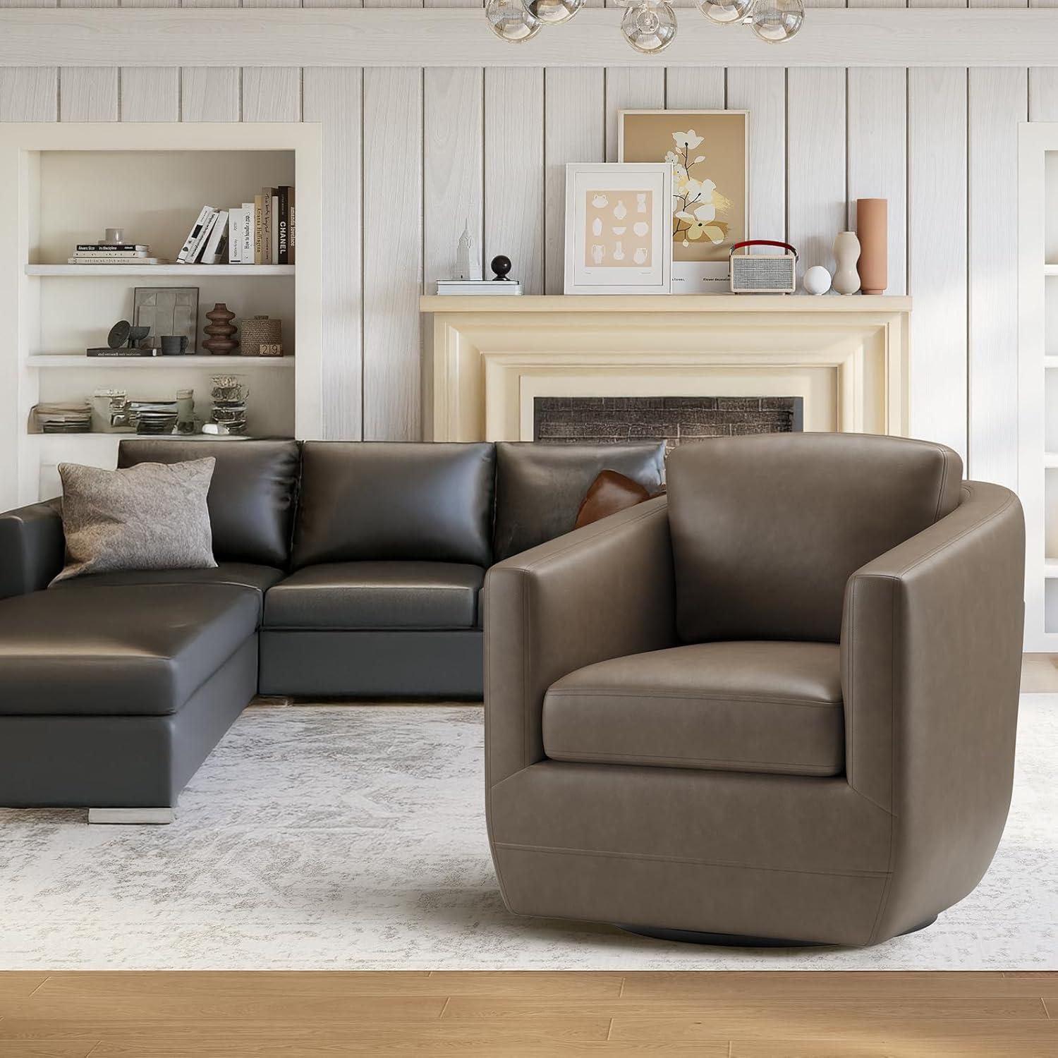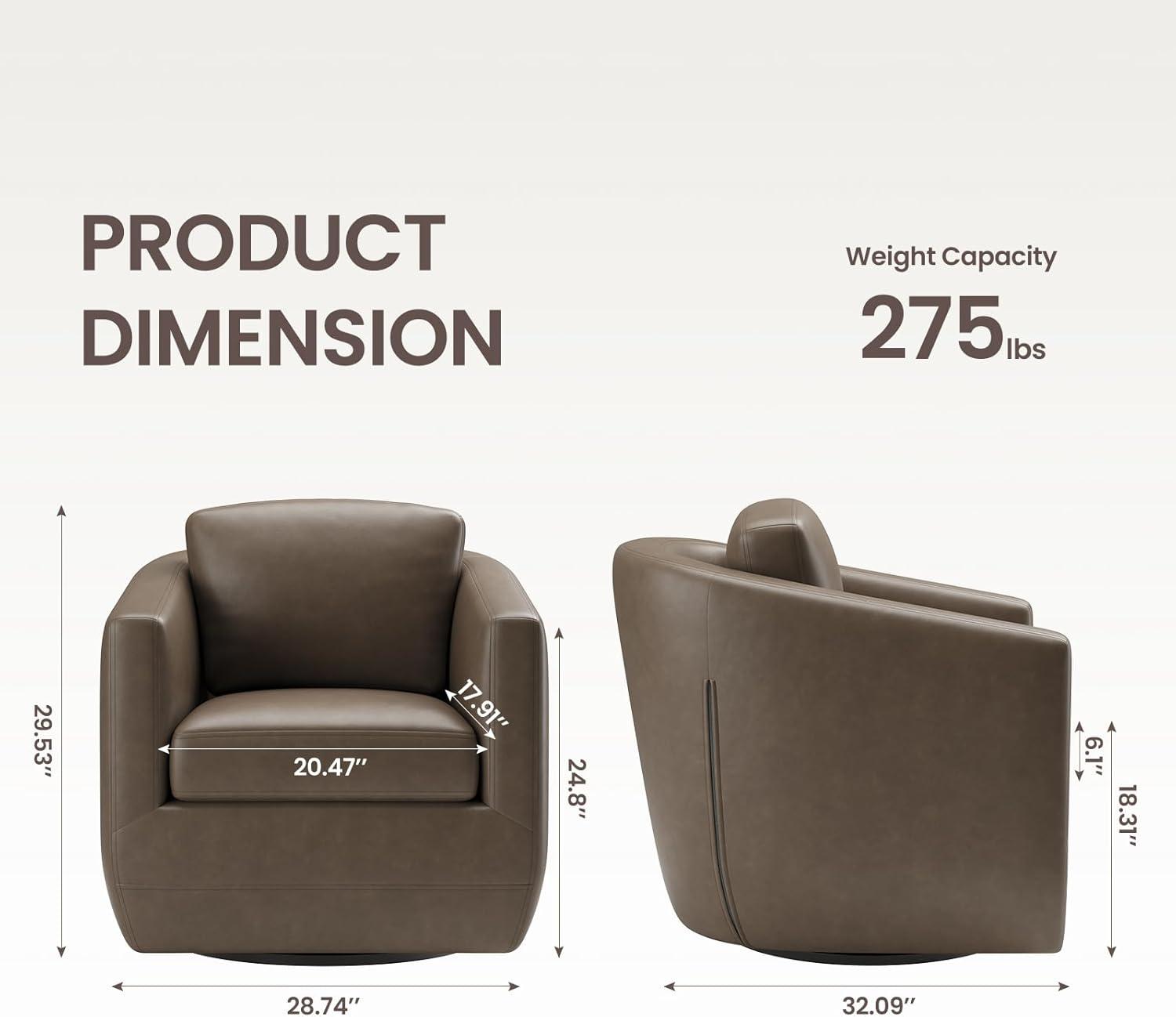 When placing our swivel chair in the bedroom, it effectively works beautifully as a cozy yet stylish companion to a vanity or a corner spot for putting on shoes.Its firm but comfortable seating height complements bedside tables or dressers, creating a neat, inviting space without overpowering the room. In the living room, this chair shines as an elegant accent piece that offers flexible seating for guests with its smooth 360° swivel and sturdy metal base, perfect for family gatherings or casual conversations. The wolf grey leather upholstery effortlessly blends with various color palettes, adding a subtle sophistication without sacrificing warmth or comfort.