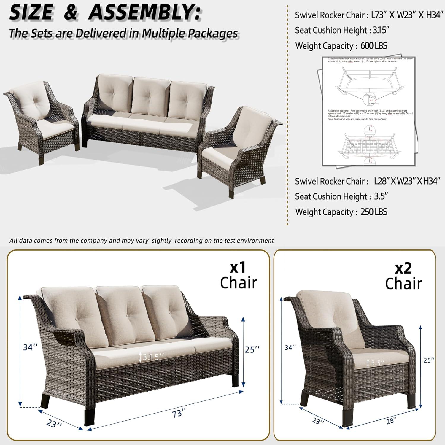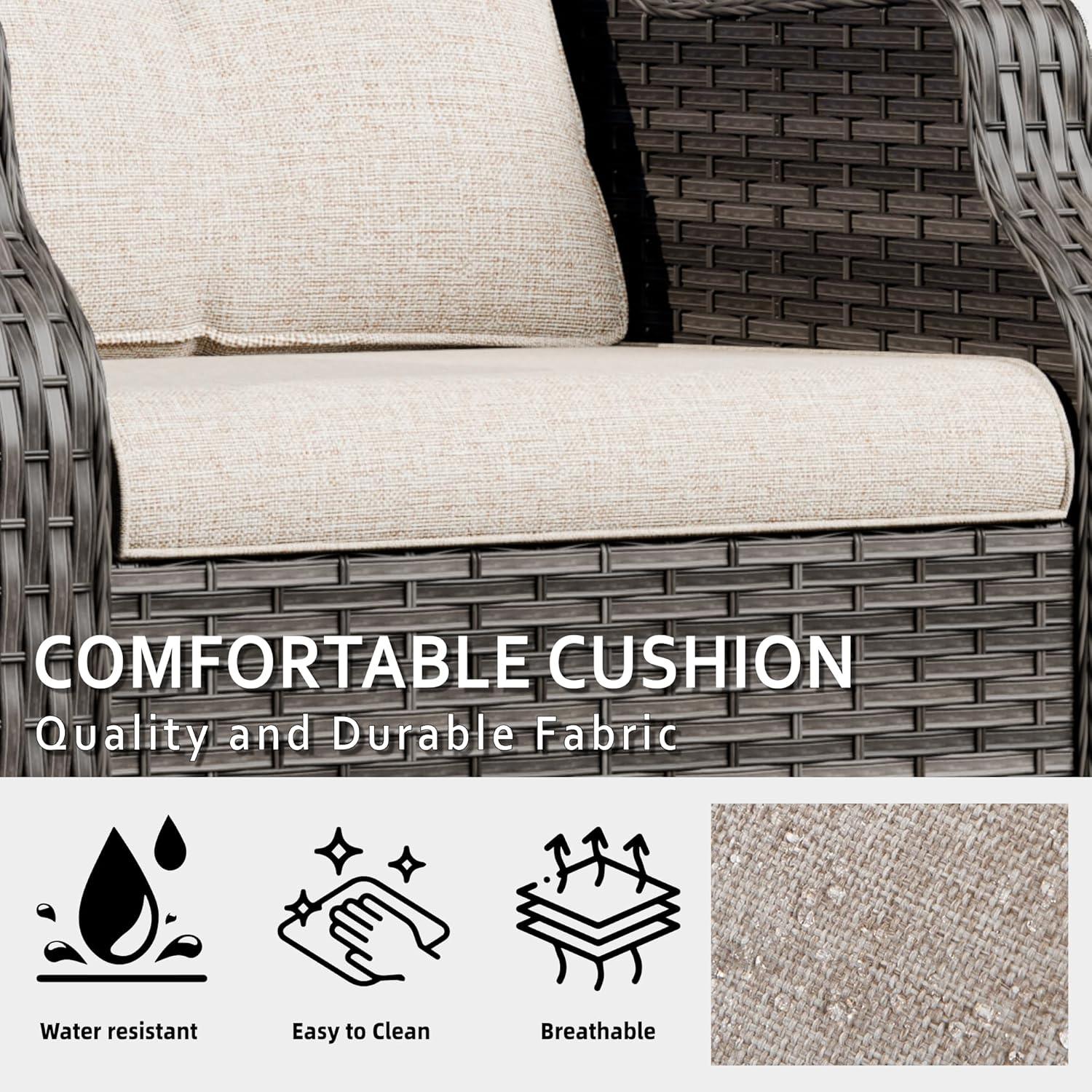 Upon unpacking the set, we instantly noticed the elegant blend of style and durability. The combination of handwoven resin wicker over a powder-coated steel frame feels solid and built to last, perfectly suited for outdoor conditions. Each piece features an ergonomic design with high backrests,widened armrests,and deep seating that invite relaxation. The beige olefin cushions are thick, soft, and splash-resistant, adding a cozy element while promising weather resilience. The two swivel chairs rotate a full 360 degrees, creating a dynamic and interactive seating experience that’s perfect for both intimate conversations and casual backyard lounging.