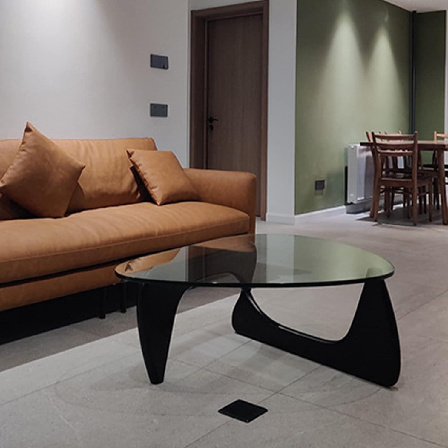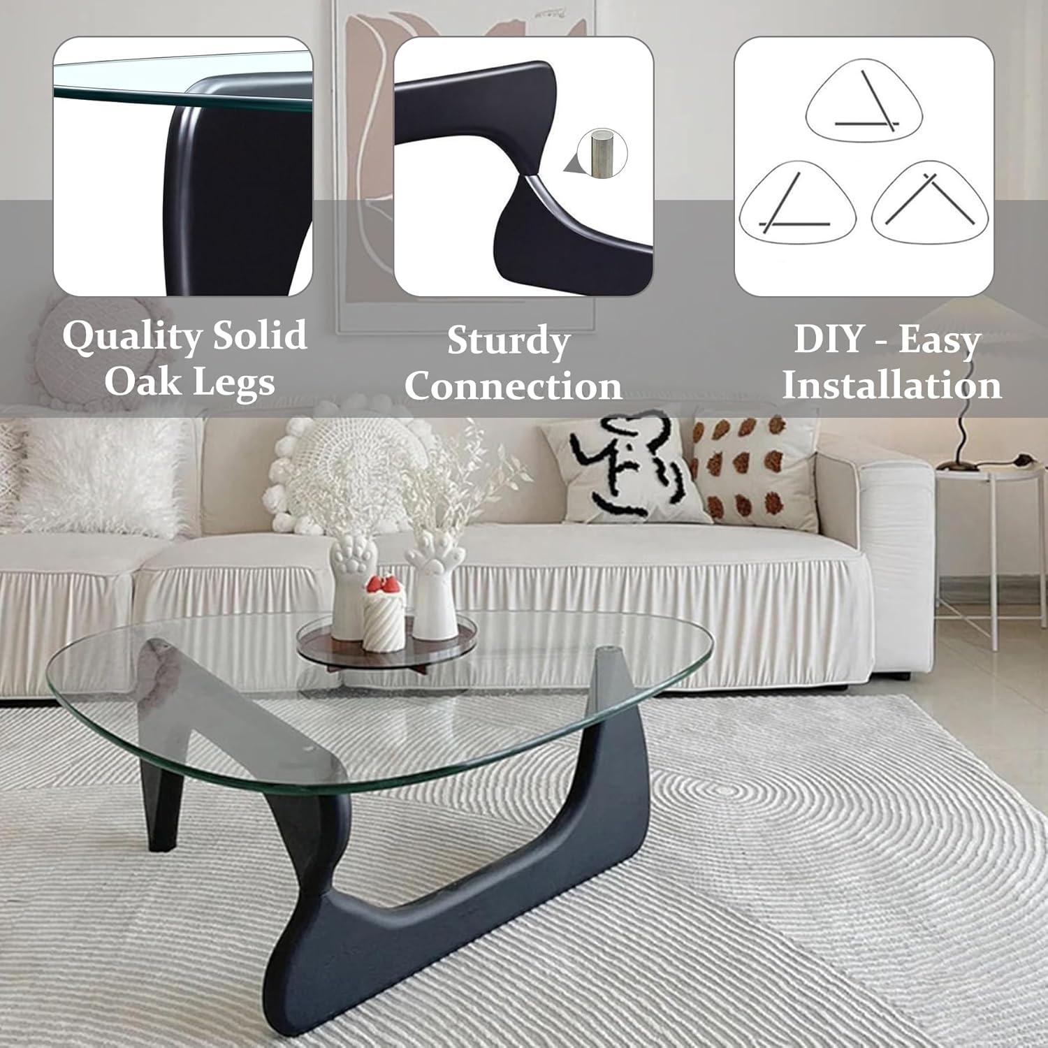 Embodying the essence of mid-century modern design, this coffee table combines a striking triangular tempered glass top with a sturdy solid oak base, delivering both elegance and functionality. The transparent surface offers a refreshing visual lightness that complements a variety of interiors, from minimalist living rooms to cozy patios and study corners. Its sleek, curved edges provide a smooth finish that is as safe as it is stylish, preventing accidental scratches while enhancing the tableS sophisticated look.The medium size (35.8″ x 25.5″ x 16″) strikes a perfect balance, making it spacious enough for daily use yet compact enough for smaller spaces without overwhelming the room.