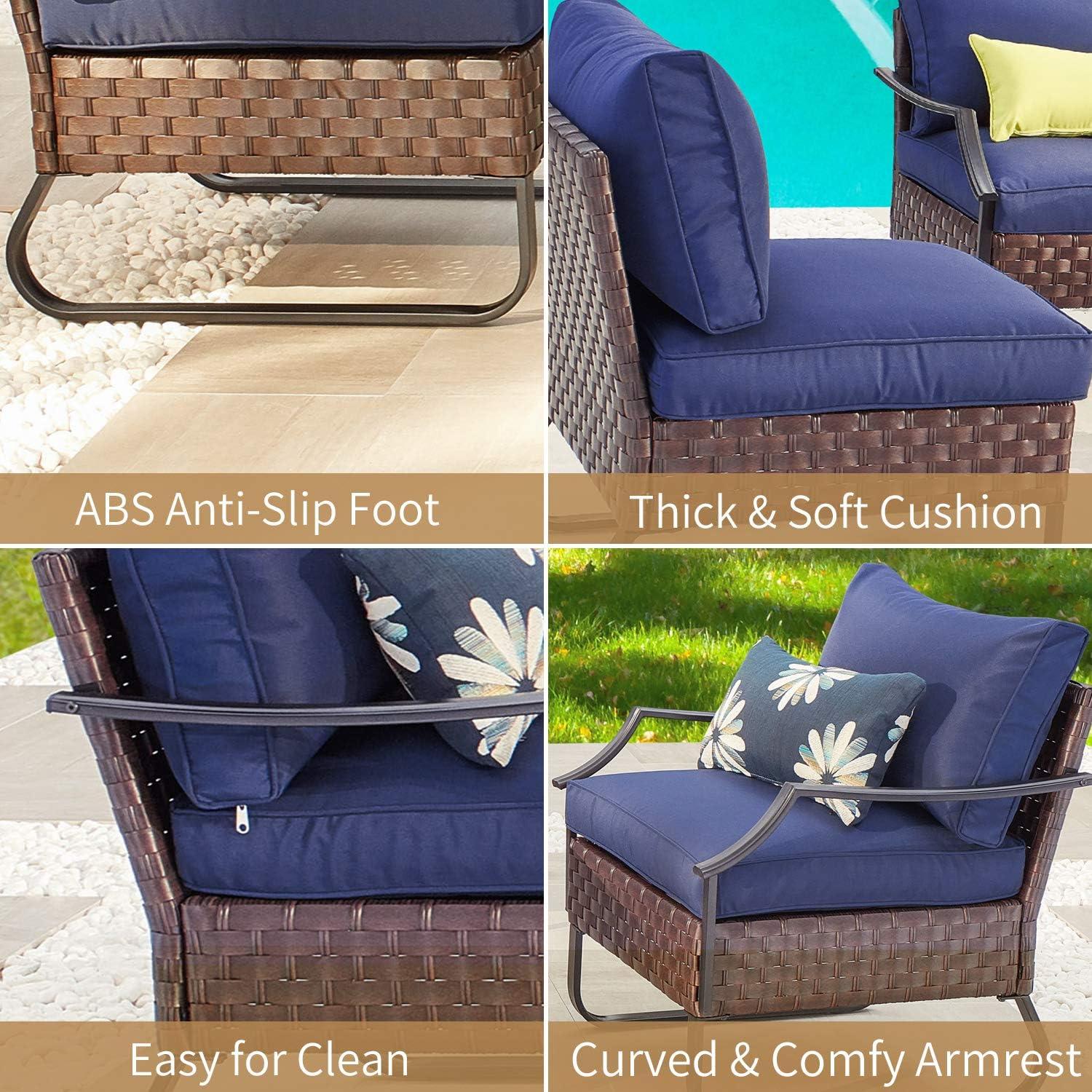 Every seat in this set is thoughtfully designed with comfort at its core. The cushions are exceptionally thick-measuring 5.1 inches for the seat and 4.7 inches for the back-filled with water-resistant mixed cotton that maintains its loft without sagging over time. Their rich blue hue not only adds a splash of color but also features stain resistance,making maintenance effortless. We love how the cushions fit snugly into the shaped sofa chairs, preventing any slipping or shifting as we relax. Plus, the wide, deep seats invite long, leisurely conversations and provide ample space for entertaining friends and family outdoors.