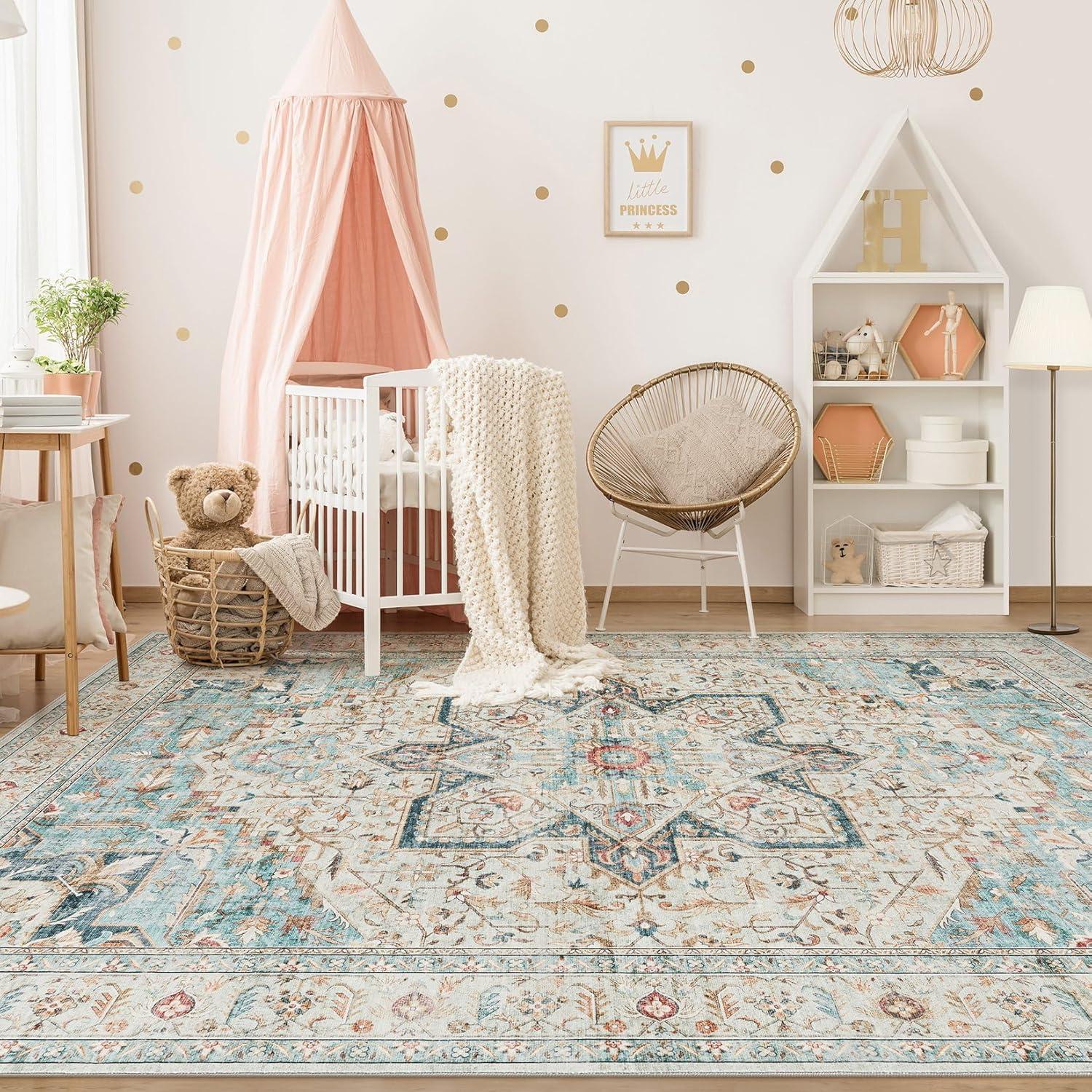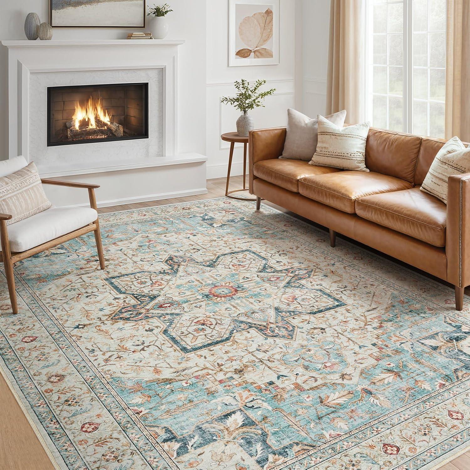 We also love layering this rug with simple metal or ceramic decor accents finished in copper or brushed brass to bring warmth and contrast to the space. Because it’s washable and highly durable, it’s perfect for homes with kids or pets; pairing it with easy-to-clean leather or microfiber upholstery makes maintenance hassle-free. Consider incorporating soft lighting like woven rattan lampshades or candles to accentuate its vintage farmhouse charm.Below is a quick reference for styling based on room types and suggested decor: