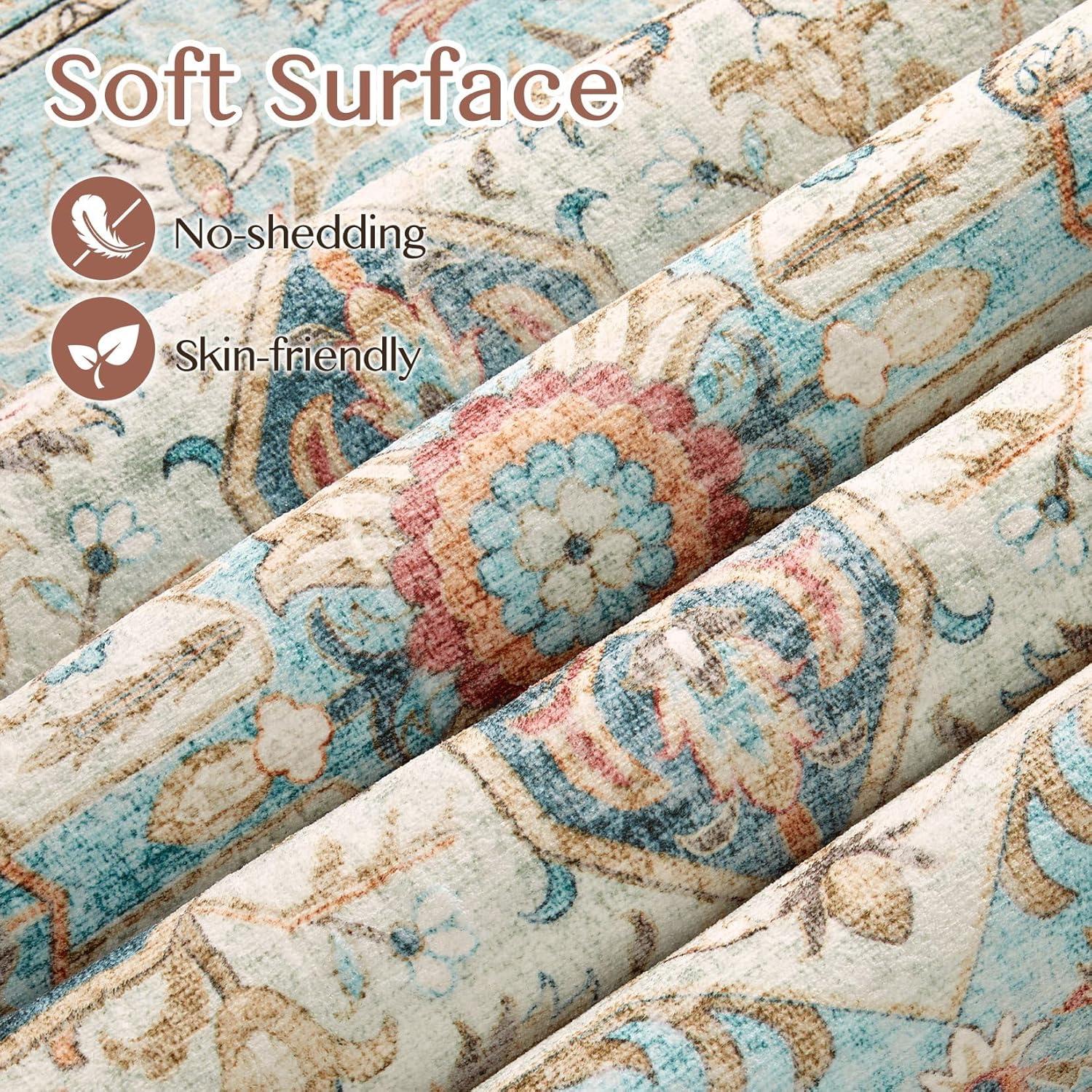 We found the color accuracy impressive, with rich, vibrant hues that remain true even after washing, maintaining that delicate vintage look. The blend of soft blues and subtle earth tones makes it versatile, adding warmth without dominating the room. The rug’s transparency and thin profile further enhance its farmhouse appeal-offering a gentle texture that feels cozy underfoot but doesn’t feel bulky or out of place in a larger setting.