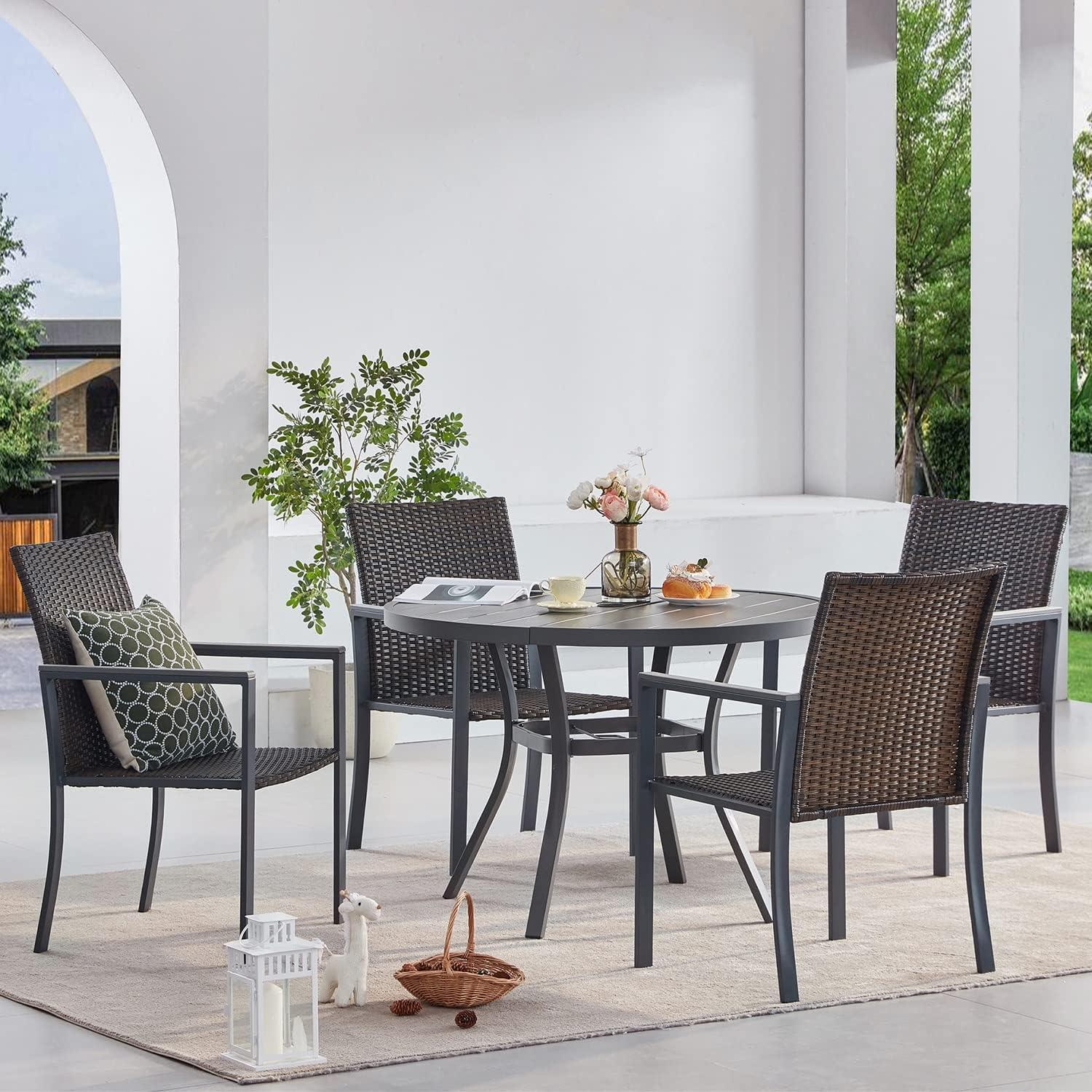 - Comfort: Supports relaxed dining with ergonomic armrests and flexible rattan.