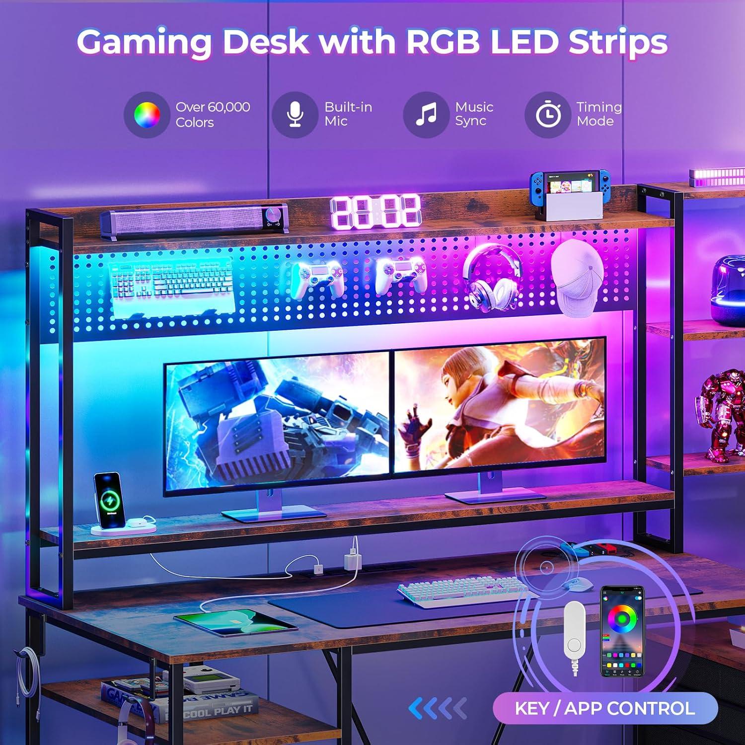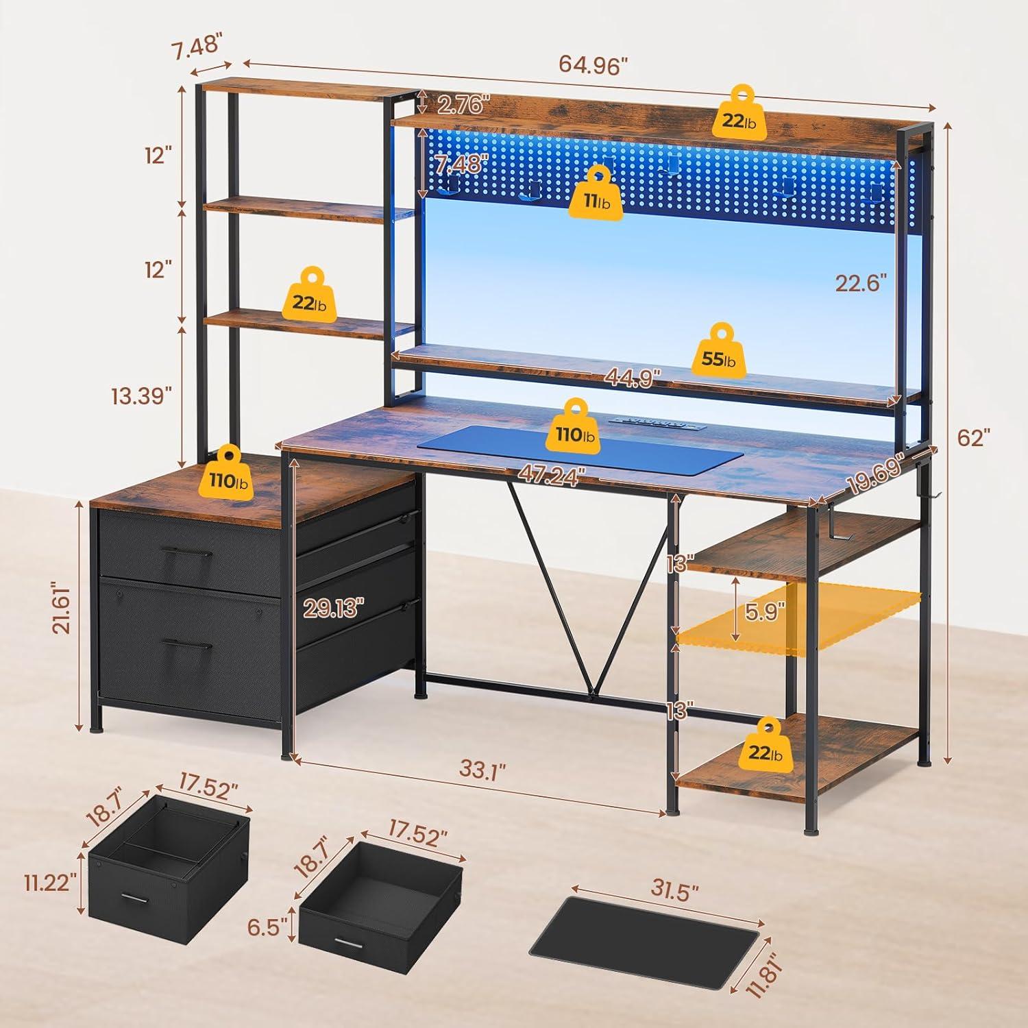 Storage is no afterthought here – the refined inclusion of two fabric drawers and a multi-tier bookshelf caters to every accessory and document we need close at hand. The multifunctional pegboard combined with hooks lets us neatly organize headphones,tools,and keys,creating a clutter-free workspace.Power outlets and USB ports integrated directly into the desk enable effortless charging of all our electronics without ever needing to reach behind the setup. Plus, the RGB LED lighting system adds a customizable splash of ambiance, syncing with music or mood to personalize our surroundings seamlessly.