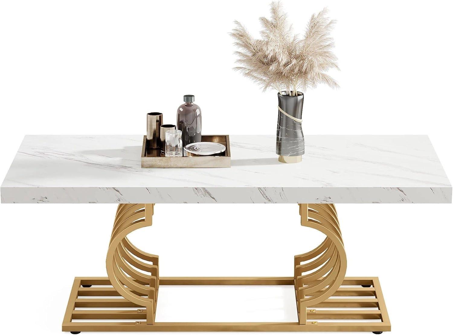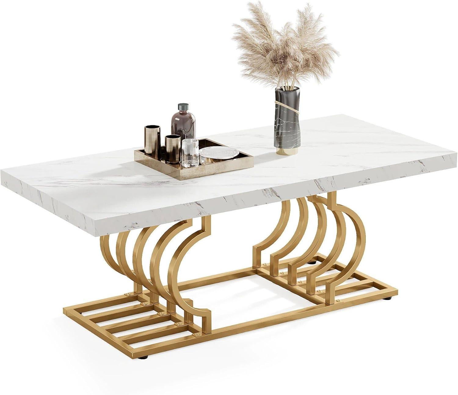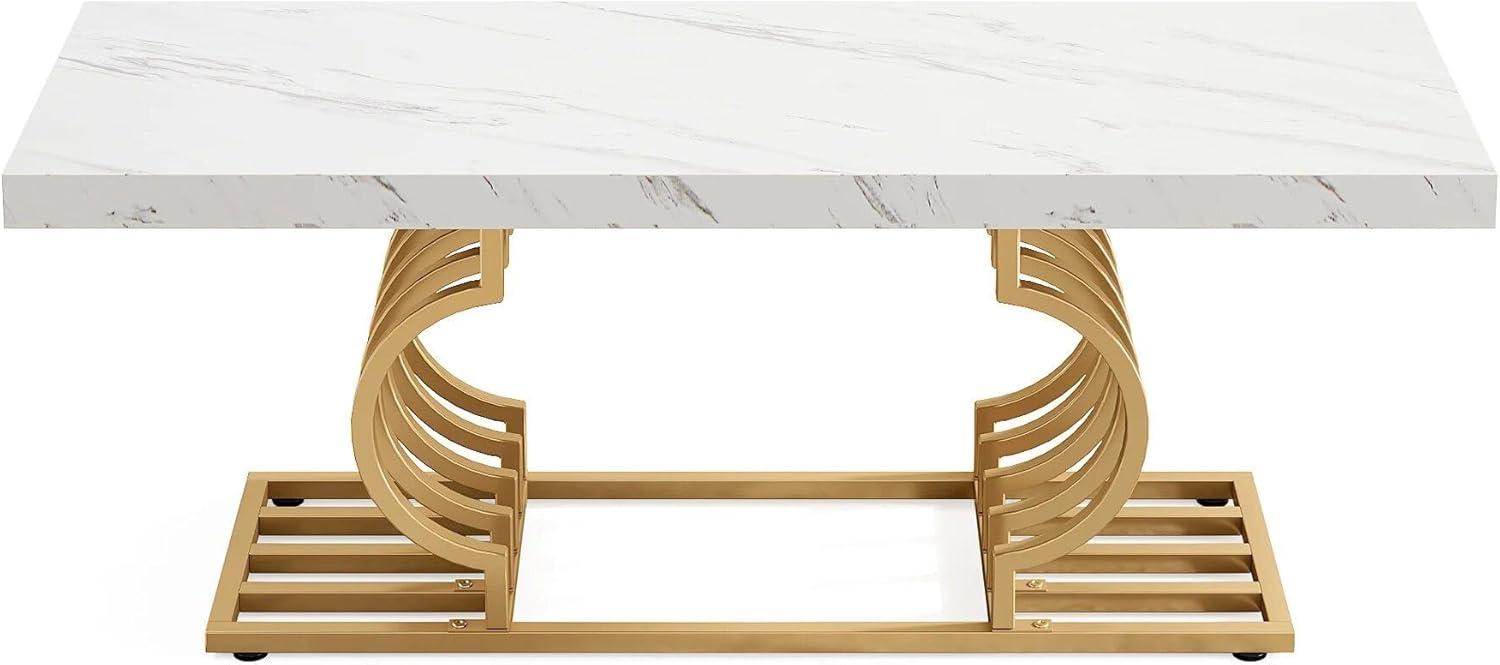 We appreciate how this coffee table seamlessly combines modern sophistication with practical design. The spacious faux marble surface provides ample room for everything from morning coffee cups to decorative accents, all while offering a sleek, polished look that brightens any space. Complementing the tabletop is a striking geometric gold frame that introduces a subtle yet luxurious flair, making the piece not only functional but a stylish statement in our living rooms, family rooms, or even dorm setups.