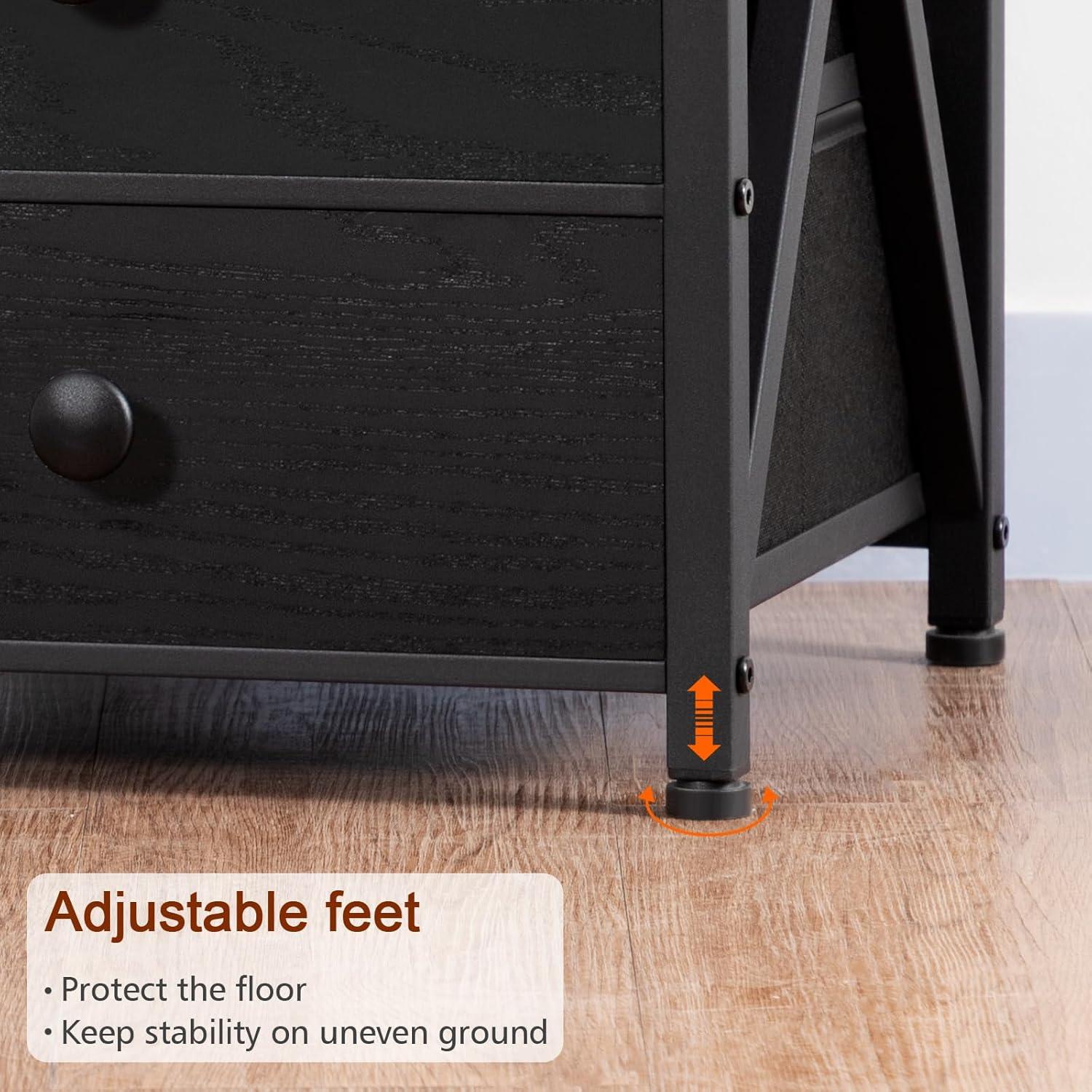 This nightstand set immediately stands out with its blend of modern functionality and practicality. Crafted from sturdy particleboard with a metal frame and featuring fabric drawers, it keeps things lightweight without sacrificing durability, supporting up to 110 pounds on the table and 11 pounds per drawer. The spacious design includes five storage areas- a large top panel, an open middle shelf, and three fabric drawers-giving plenty of room for bedside essentials and decorative accents. The sleek black finish combined with FSC-certified wood panels adds a stylish touch that easily complements various bedroom or living room decors. Plus, the built-in charging station equipped with 2 AC outlets, a USB port, and a USB-C port provides a convenient way to keep devices powered up overnight.