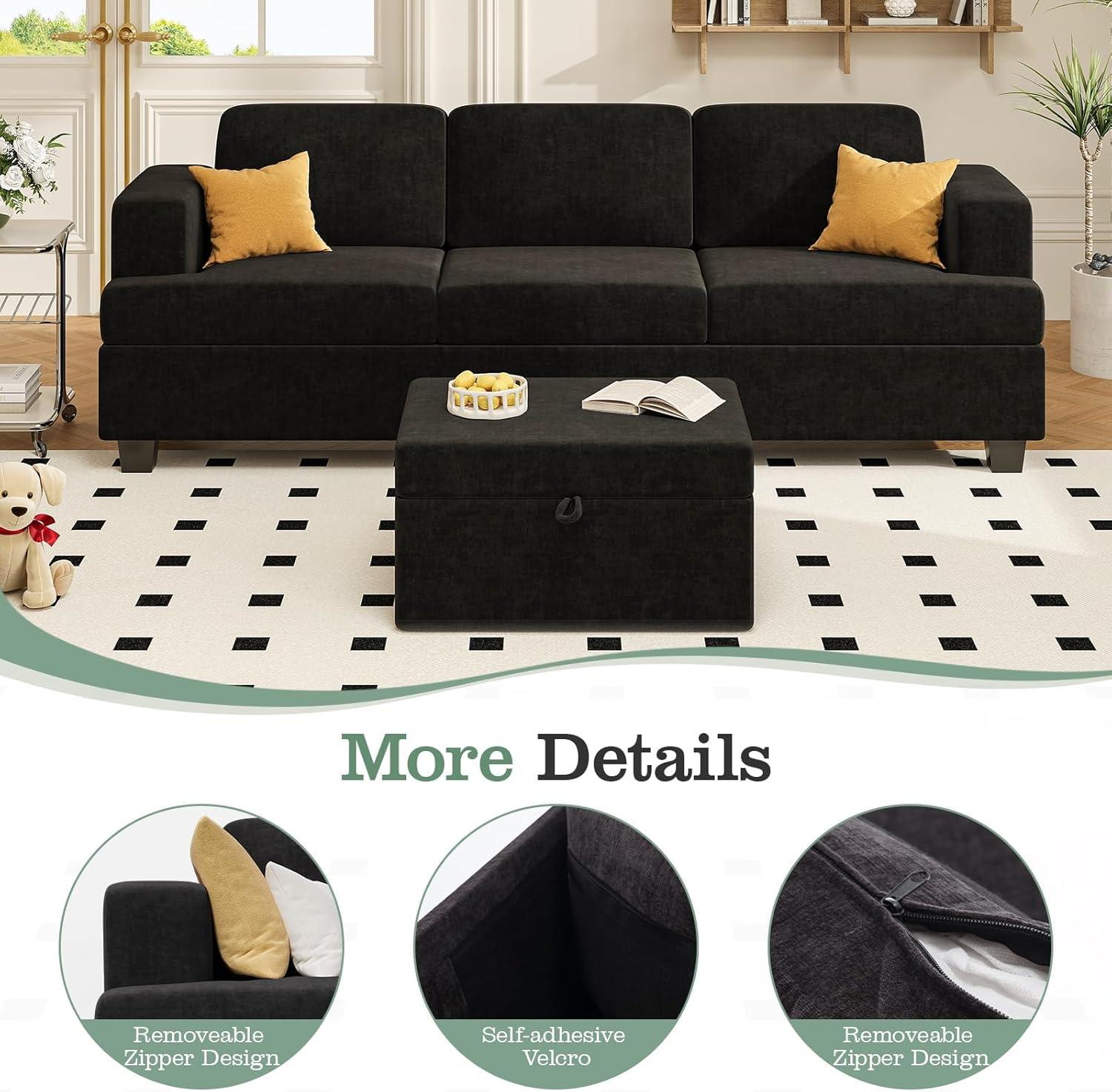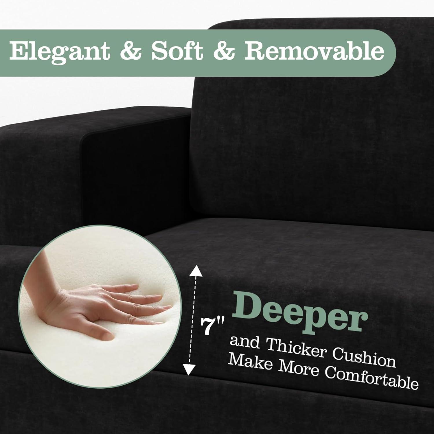 The black chenille upholstery proves to be exceptionally practical for daily living spaces, balancing softness with durability.The fabric’s texture is pleasantly smooth to the touch, creating a cozy yet refined atmosphere that welcomes relaxation. Its dark hue effectively masks minor stains and wear, making it ideal for households with pets or children. Additionally, the self-adhesive Velcro design of the cushions ensures they stay firmly in place, preventing sliding during use and maintaining an orderly appearance without constant adjustment. Cleaning is also straightforward, as the cushion covers are detachable and easy to maintain, which is a big plus for keeping the sofa looking fresh over time.