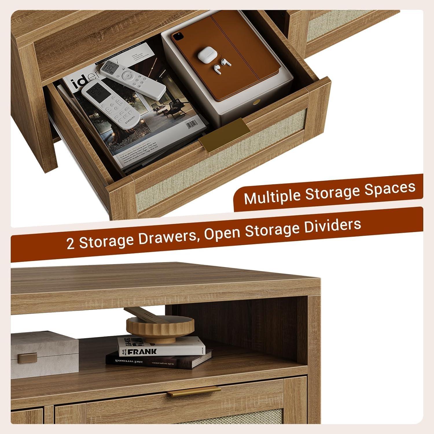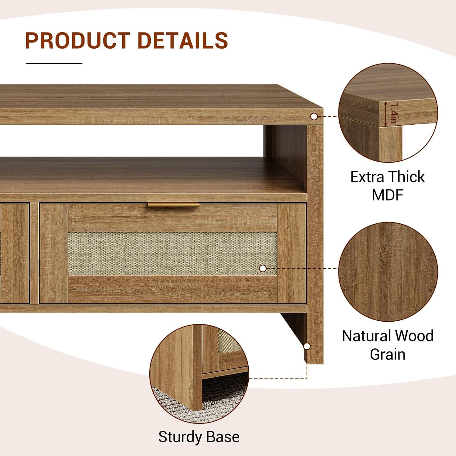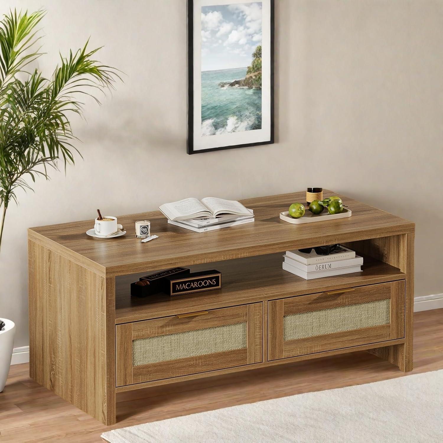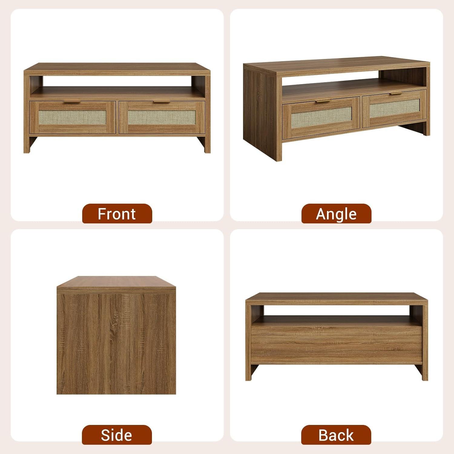 After spending considerable time with this coffee table, we found it strikes a perfect balance between style and functionality. Its blend of natural wood grain and woven rattan drawers brings a warm, bohemian vibe that complements a wide range of interior decors from mid-century modern to farmhouse chic. the addition of elegant gold handles and smooth drawer mechanisms adds a refined touch without compromising practicality. The open display shelf alongside two spacious drawers offers versatile storage options that effortlessly keep everyday essentials like books, remotes, and board games organized yet accessible.