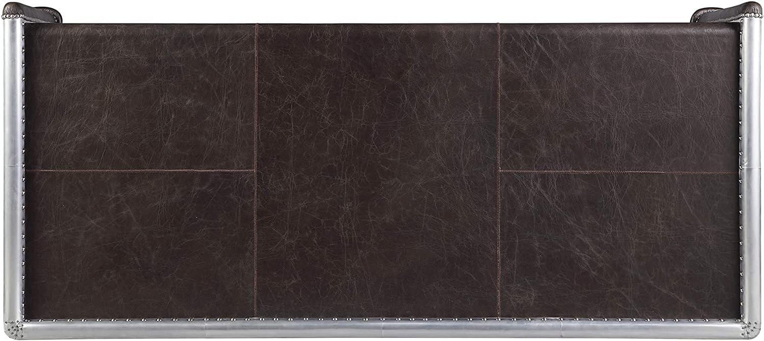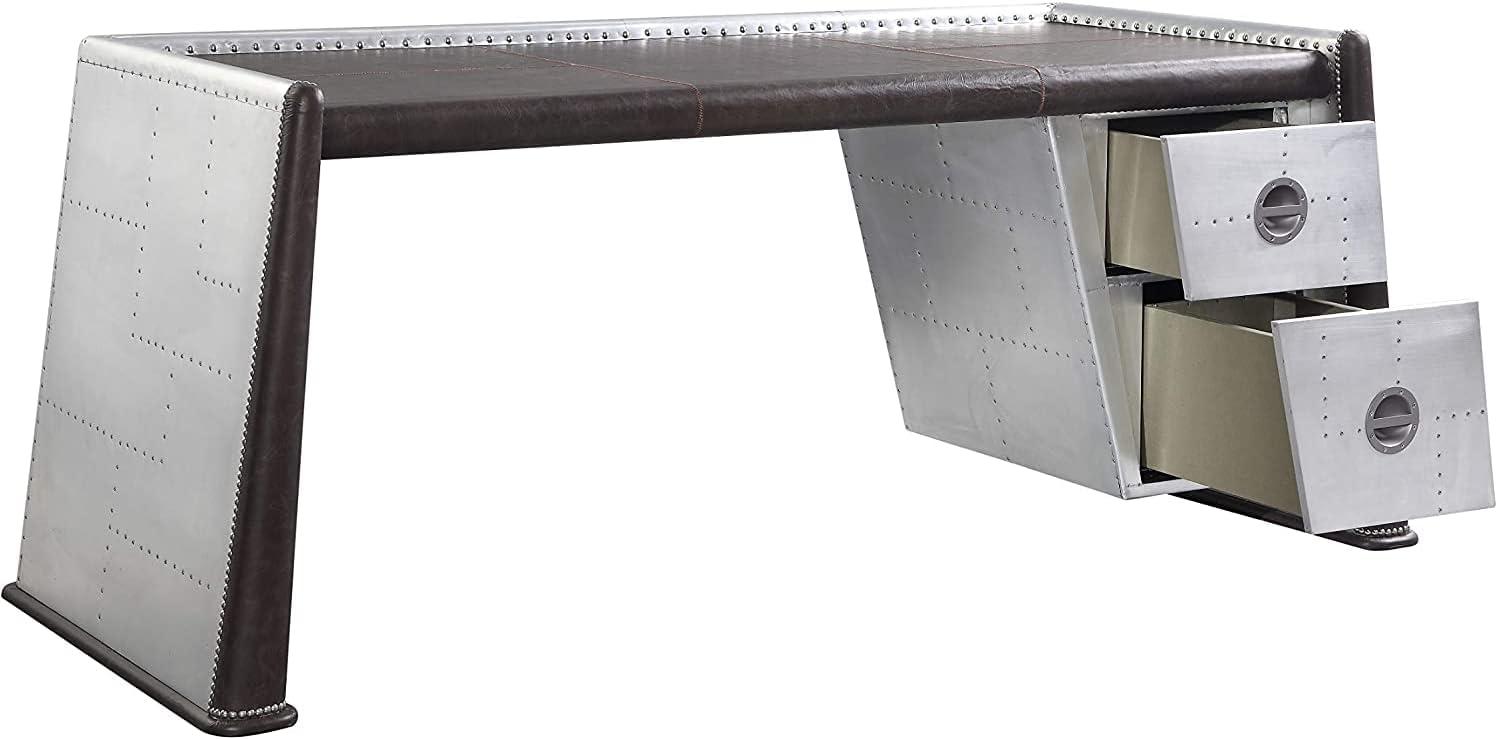 The unique blend of distressed chocolate top grain leather and industrial aluminum frame lends itself beautifully to a variety of decor themes. For those embracing a modern industrial vibe, pairing the desk with exposed brick walls, metal accent chairs, and vintage Edison bulbs will highlight its raw craftsmanship and rugged charm. Alternatively, it harmonizes with a coastal-inspired setup by incorporating soft blues, natural linens, and driftwood accessories, emphasizing the nautical undertones of its aluminum construction and distressed finish. The desk’s angled shape and patchwork rivet details make it a standout piece that complements both minimalist and eclectic interiors without overwhelming them.