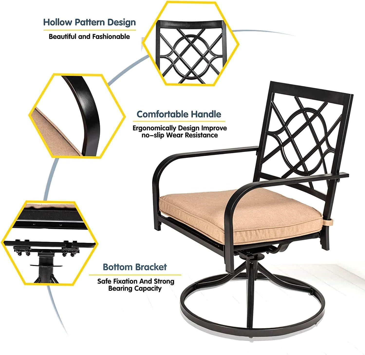 the metal swivel chairs in this set offer a remarkable blend of comfort and practicality that instantly enhanced our outdoor relaxation experience.Featuring a 360° swivel and rocker function, each chair allows for easy movement while seated, making conversations and leisure more enjoyable. The 2.7-inch padded cushions provide just the right amount of softness without compromising support, and the sturdy metal frame comfortably holds up to 300 pounds. We were notably impressed by the weather-resistant e-coating on the metal, which ensures durability against rust and outdoor elements, making these chairs feel like a long-term investment for our patio space.