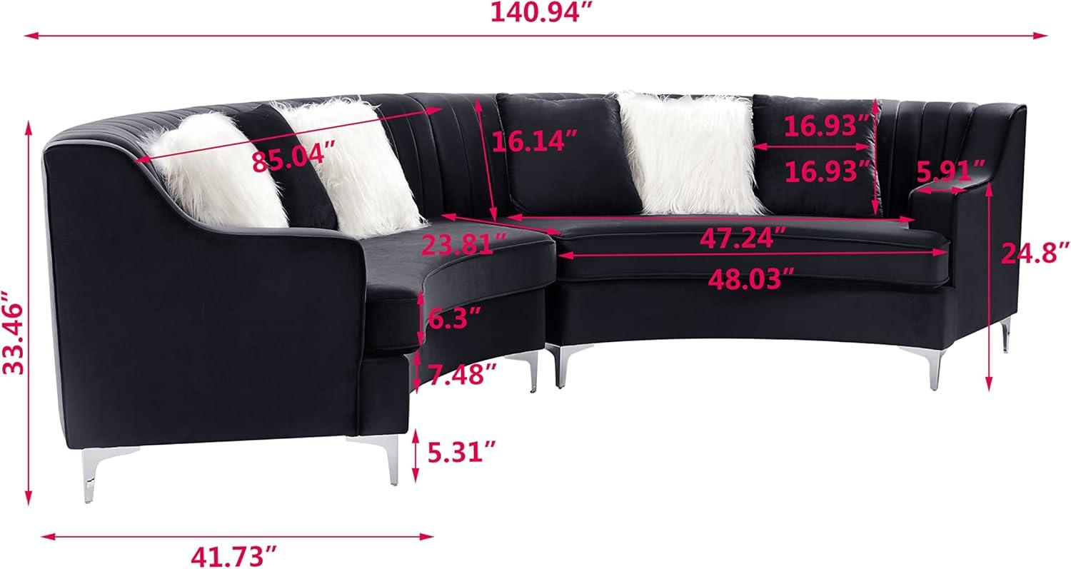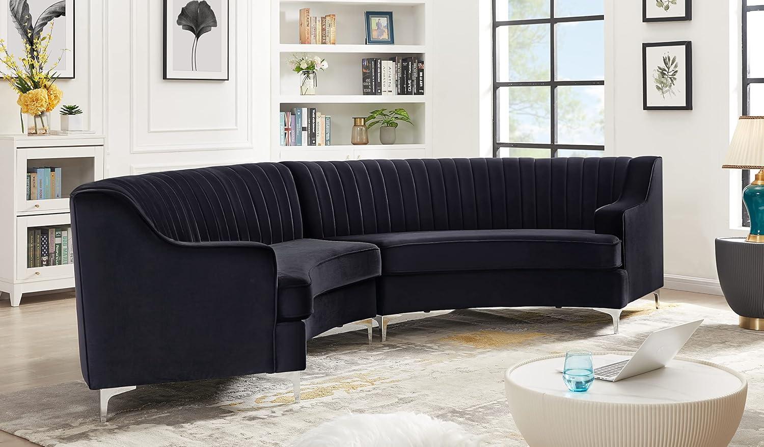 The modern tufted design of this sectional sofa truly redefines contemporary living room aesthetics. Its symmetrical, semi-circular shape creates an inviting and harmonious flow, perfect for both large spaces and open-concept layouts. The combination of smooth velvet upholstery and the subtle tufting detail adds a layer of sophistication without overwhelming the room. Paired with sleek metal legs in a polished silver finish, the sofa blends softness with industrial elegance, making it an instant centerpiece. The inclusion of six thoughtfully designed pillows,in natural and textured white tones,enhances the tactile and visual appeal,introducing a delicate balance of comfort and style.