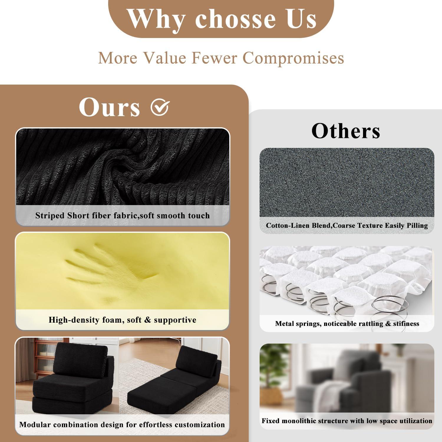Versatile design: Transforms easily from a comfy 1-seater sofa to a lounge or even a mattress,perfect for multifunctional spaces. | Hip joint gap: When laid flat as a bed, the seam between cushions can cause some sinking in the middle. |