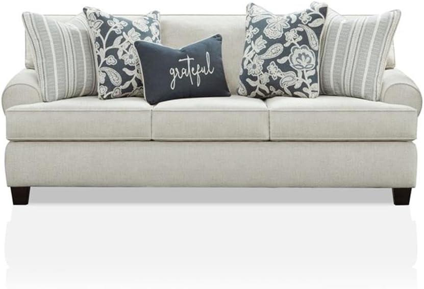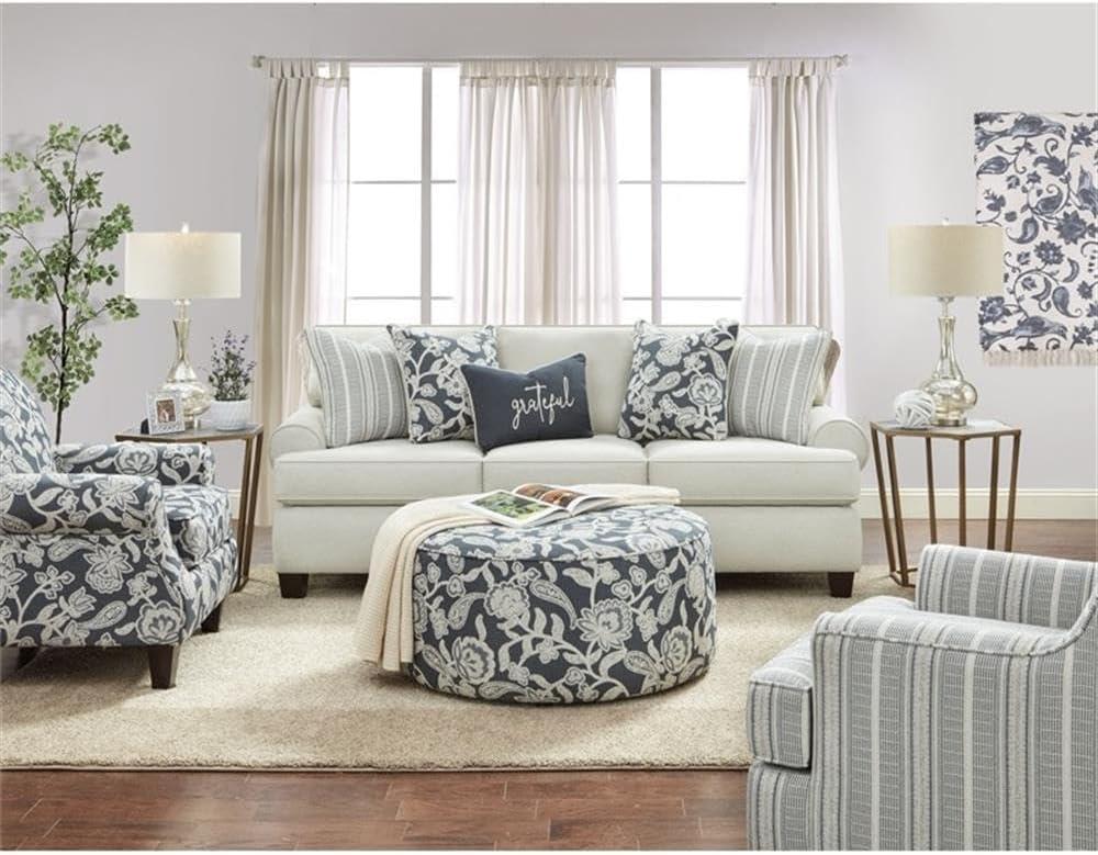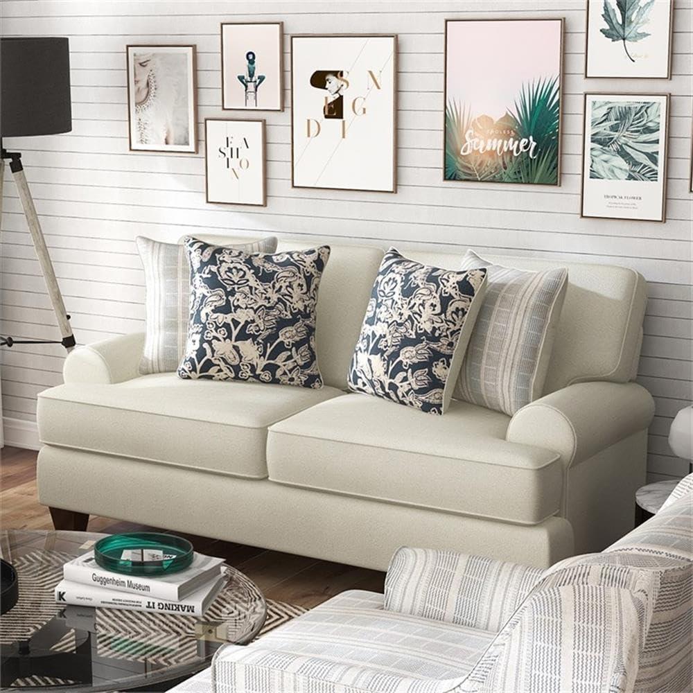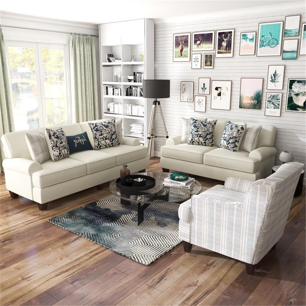 Our living space instantly gained a fresh and inviting ambiance thanks to the soft ivory chenille upholstery that gracefully blends with almost any color scheme. the transitional style walks the perfect line between classic and contemporary, allowing the set to complement both modern and customary décors seamlessly. We especially appreciate the rolled arms and tapered legs, which offer subtle elegance without overwhelming the room.The inclusion of patterned pillows in navy blue and gray adds just the right contrast,introducing texture and visual interest that make the seating arrangement feel warm and thoughtfully styled.
