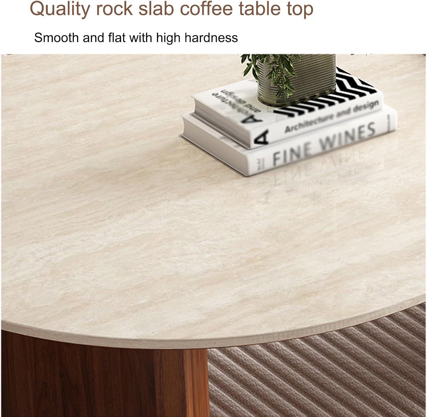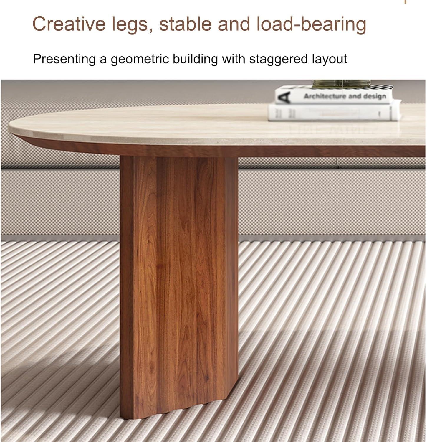after using this table daily, we’ve found its durability to be truly impressive. The combination of a rock slab tabletop with solid wood legs creates a sturdy yet stylish centerpiece that withstands the usual wear and tear of busy living spaces. The robust materials ensure it remains stable and resists scratches or dents, even when minor bumps occur. The rounded edges not only contribute to the sleek modern aesthetic but also add a safety element, preventing sharp corners from becoming an issue in homes with children or pets.Its timeless design and build quality make it a reliable piece that’s meant to endure our active routines.