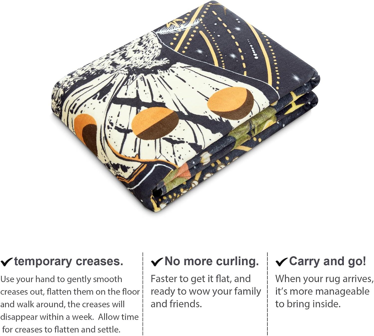 This rug brings a captivating blend of vintage charm and contemporary functionality, making it a distinctive addition to any living space. Its ultra-thin, low-pile design ensures versatility, fitting seamlessly under dining tables or in snug dorm rooms without disrupting furniture placement. Crafted from plush, faux wool, it offers a soft touch that feels welcoming underfoot while maintaining durability with no shedding or fading.The celestial moth motif paired with moody black floral aesthetics lends a unique boho and retro vibe, perfect for those seeking to express an indie or hippie-inspired style while elevating the atmosphere of bedrooms, entryways, or living rooms.