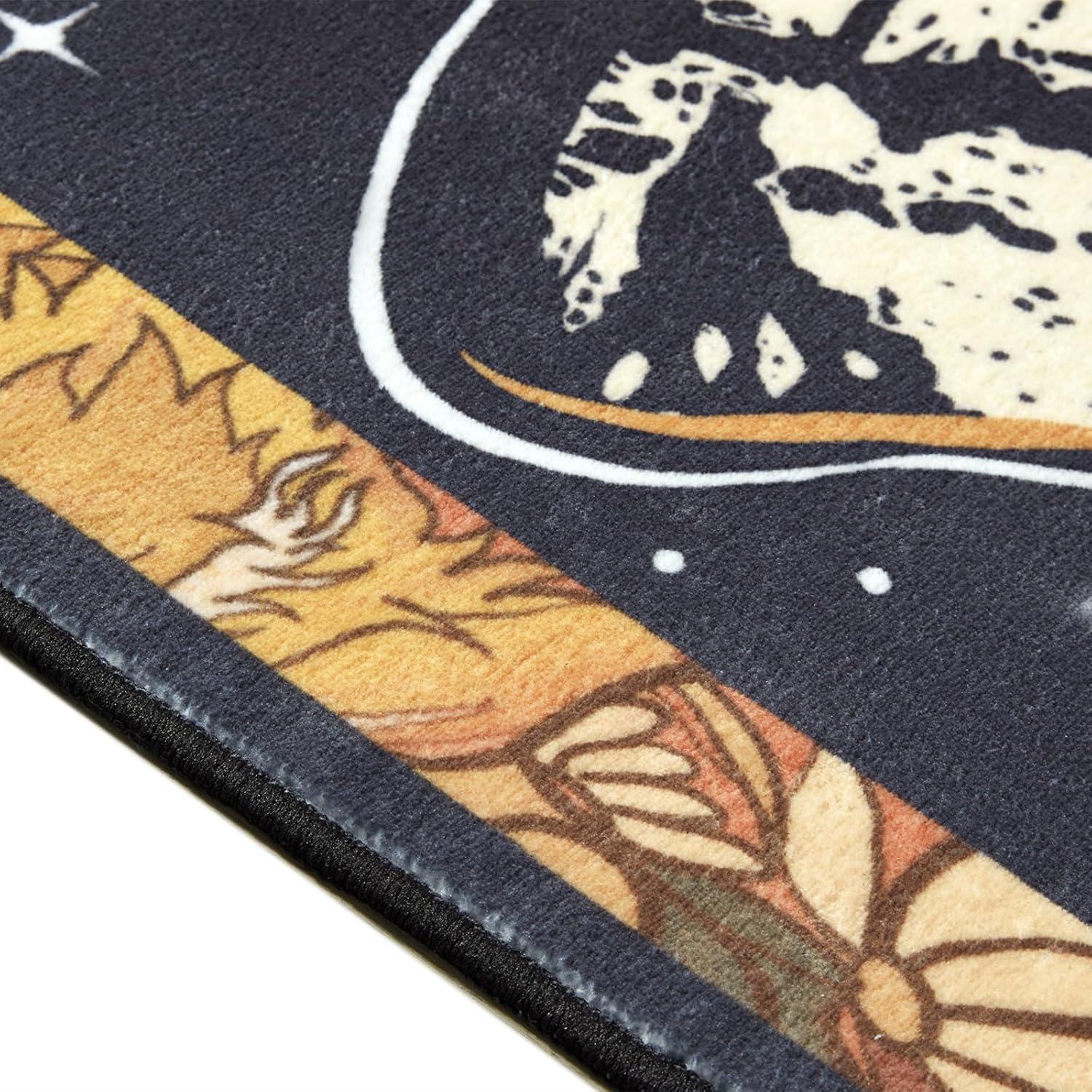 Bringing a vintage hippie celestial vibe into any space, this rug acts as an instant mood lifter with its unique blend of boho flair and mystical charm. The intricate luna moth design, paired with moody black and floral accents, not only adds a layer of visual interest but also evokes a sense of calm and nostalgia. Its ultra-thin, low-pile construction allows it to seamlessly fit under furniture, making it a versatile piece suitable for living rooms, bedrooms, dining areas, and even entryways. The combination of style and function means this rug enhances any décor by creating an inviting yet sophisticated atmosphere without overwhelming the existing design.