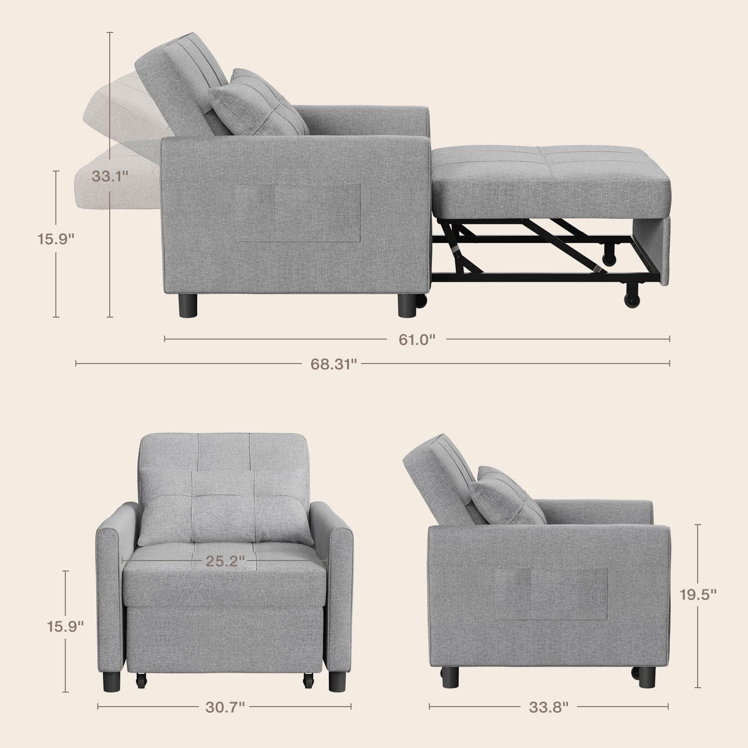 We found this versatile piece to be an excellent addition to any living space that values both style and functionality. Crafted with a sturdy high-quality steel frame, it supports up to 330 lbs, promising durability for everyday use. The breathable linen upholstery paired with high-density foam offers impressive comfort whether you’re sitting,reclining,or sleeping. Its sleek grey fabric blends seamlessly into modern interiors, and the 3-in-1 convertible design easily switches between an armchair, recliner, and full sleeper bed, making it perfect for small apartments, dorms, or home offices.