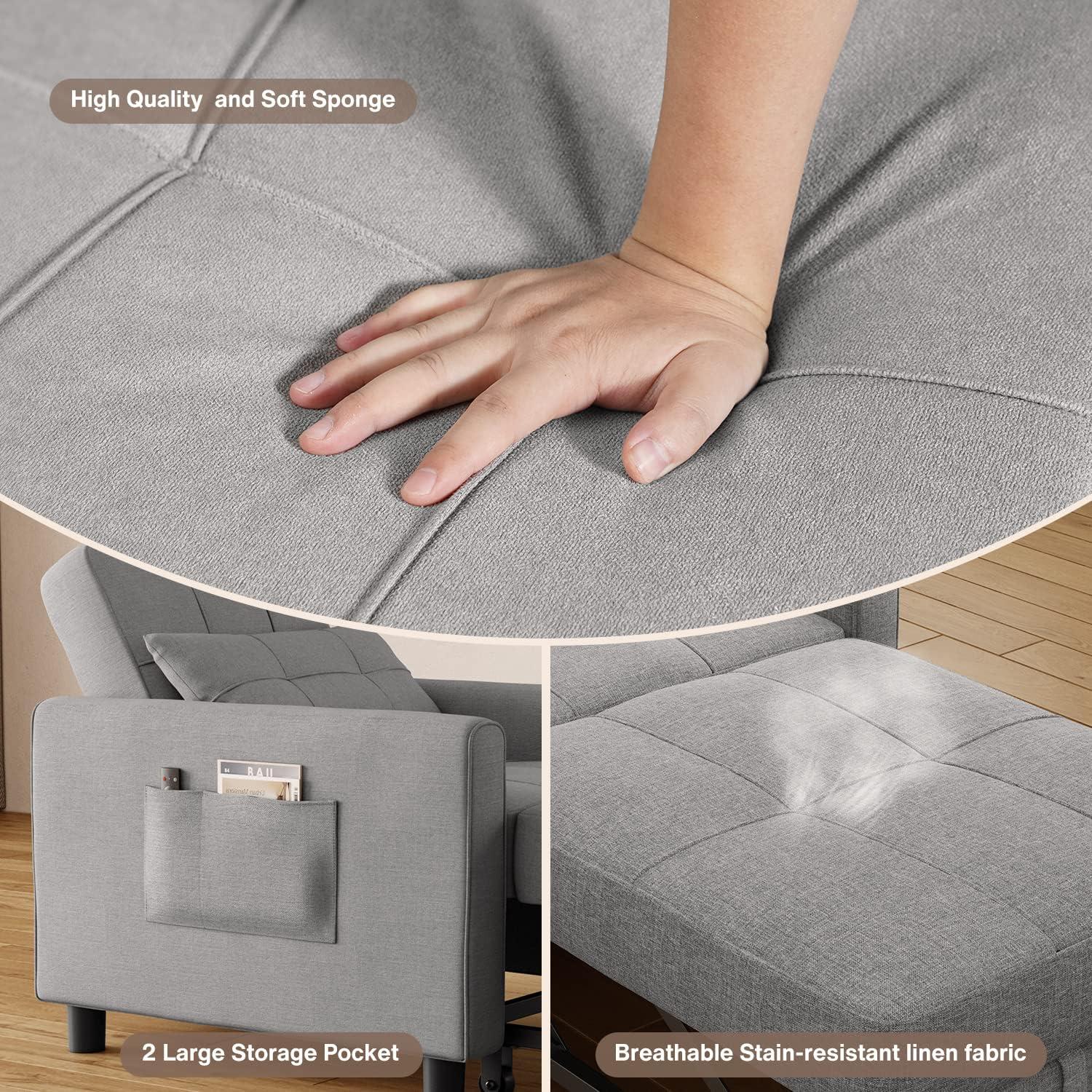 After testing this versatile piece, we beleive it’s an excellent choice for anyone needing functionality without sacrificing style in limited spaces. Its robust steel frame and breathable linen fabric combine durability and comfort effortlessly, supporting up to 330 lbs. The adjustable backrest, with three distinct angles, allows seamless transition between relaxing, reading, or napping – making it ideal for living rooms, apartments, or home offices. The quick pullout mechanism on wheels makes converting it into a guest bed or recliner smooth and hassle-free, accommodating a variety of daily uses.