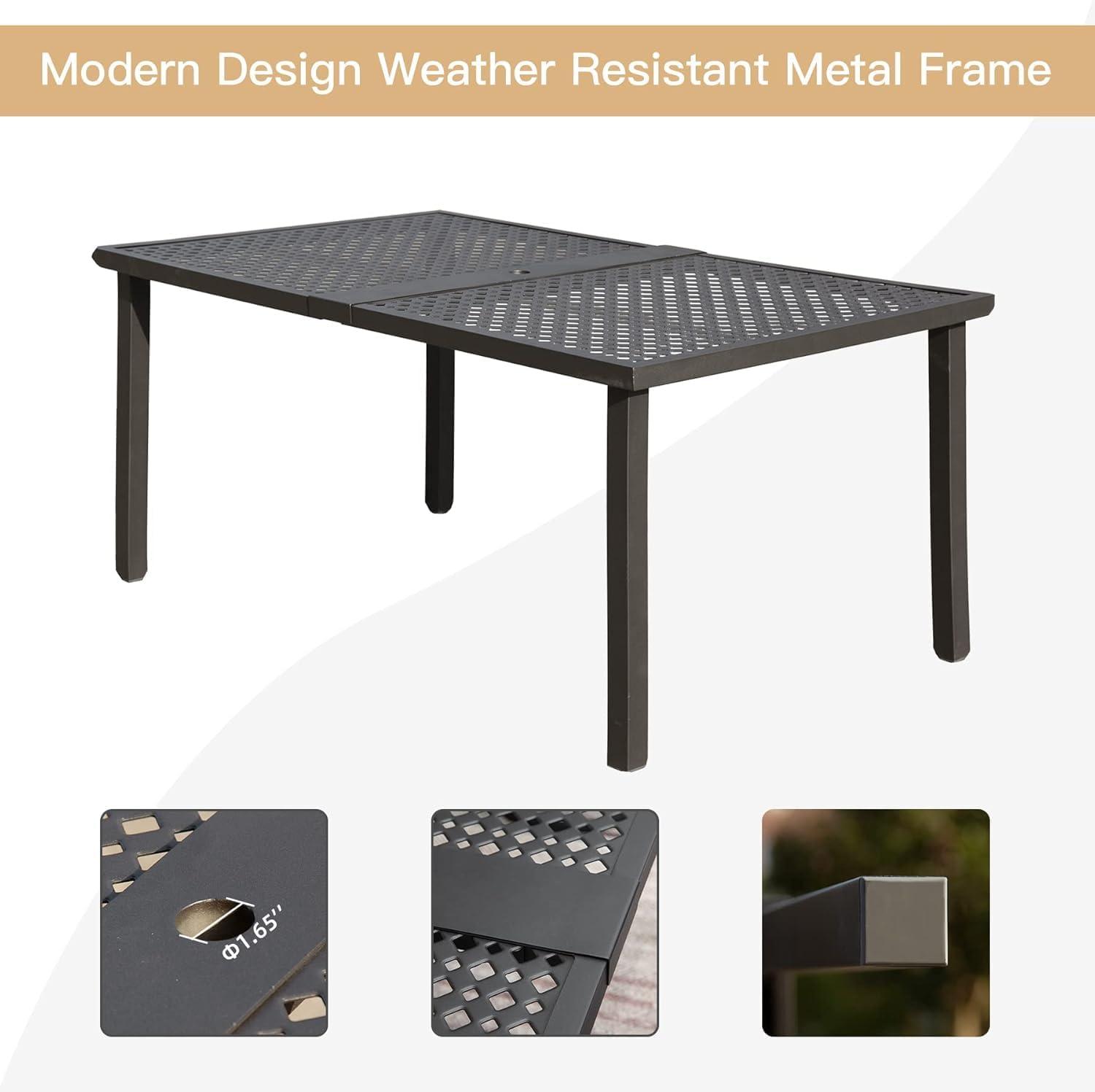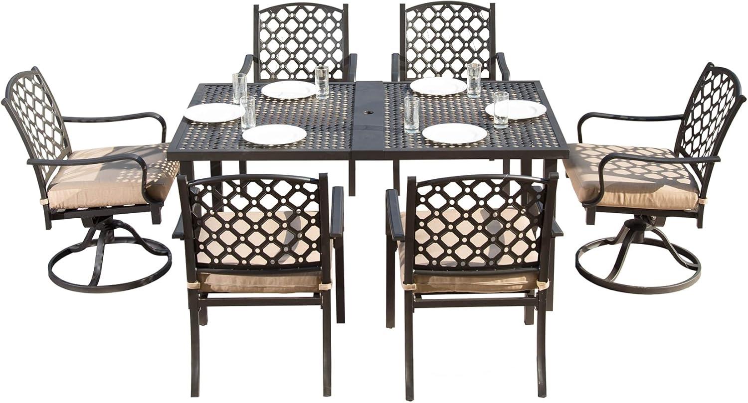 Our experience with this 7-piece patio dining set has been nothing short of satisfying. The solid metal table is not onyl sturdy, but its thoughtful design incorporates drainage holes that effectively prevent water pooling, making it highly suitable for diverse weather conditions.The set strikes a perfect balance between vintage charm and modern durability, featuring an antique bronze finish complemented by a refined plaid pattern. Comfort-wise, the chairs are outstanding - their ergonomic form with curved armrests and an iron frame that supports up to 350 lbs ensures a relaxed seating experience. The plush 6.8-inch thick cushions add a cozy touch and are easily removable, which makes cleaning a breeze.