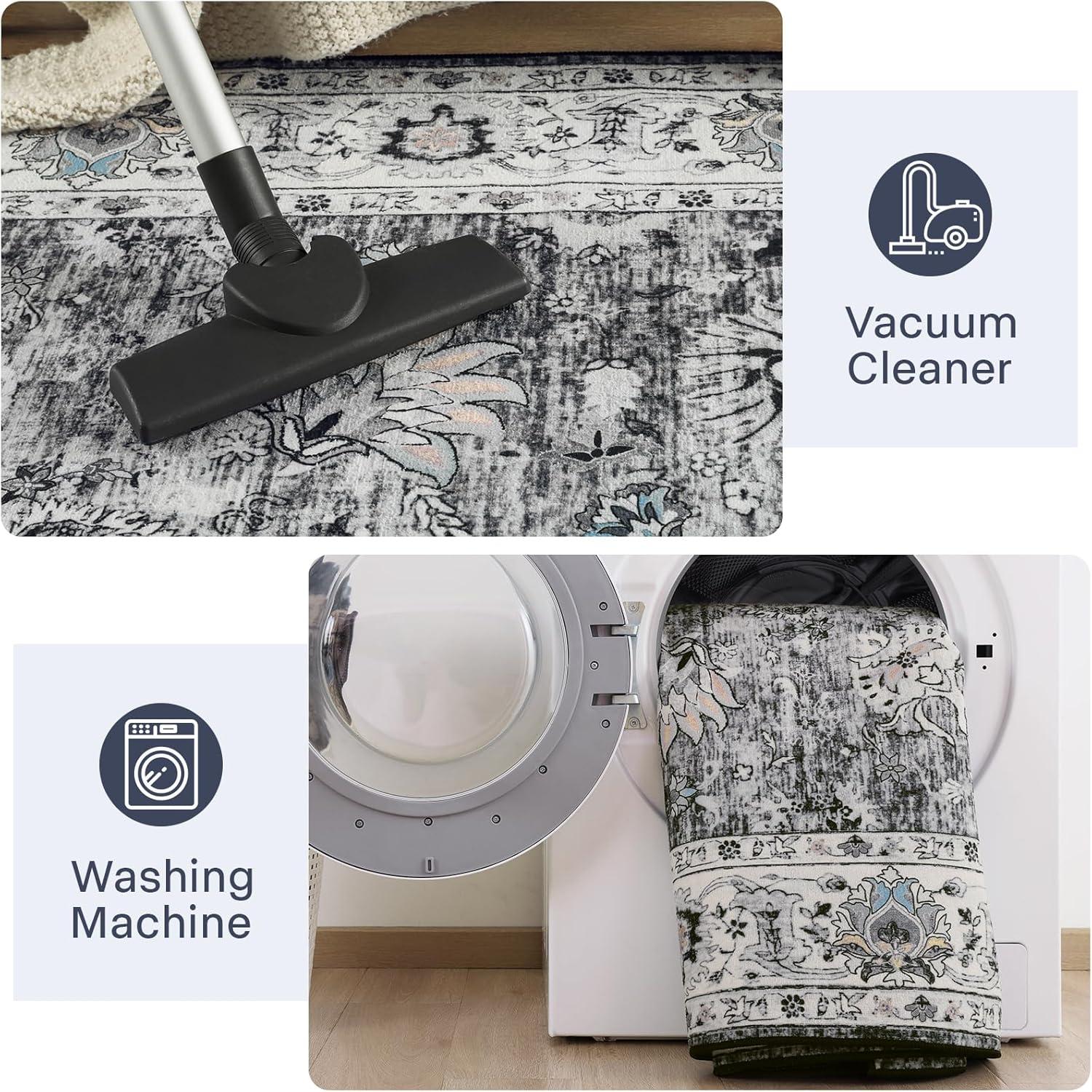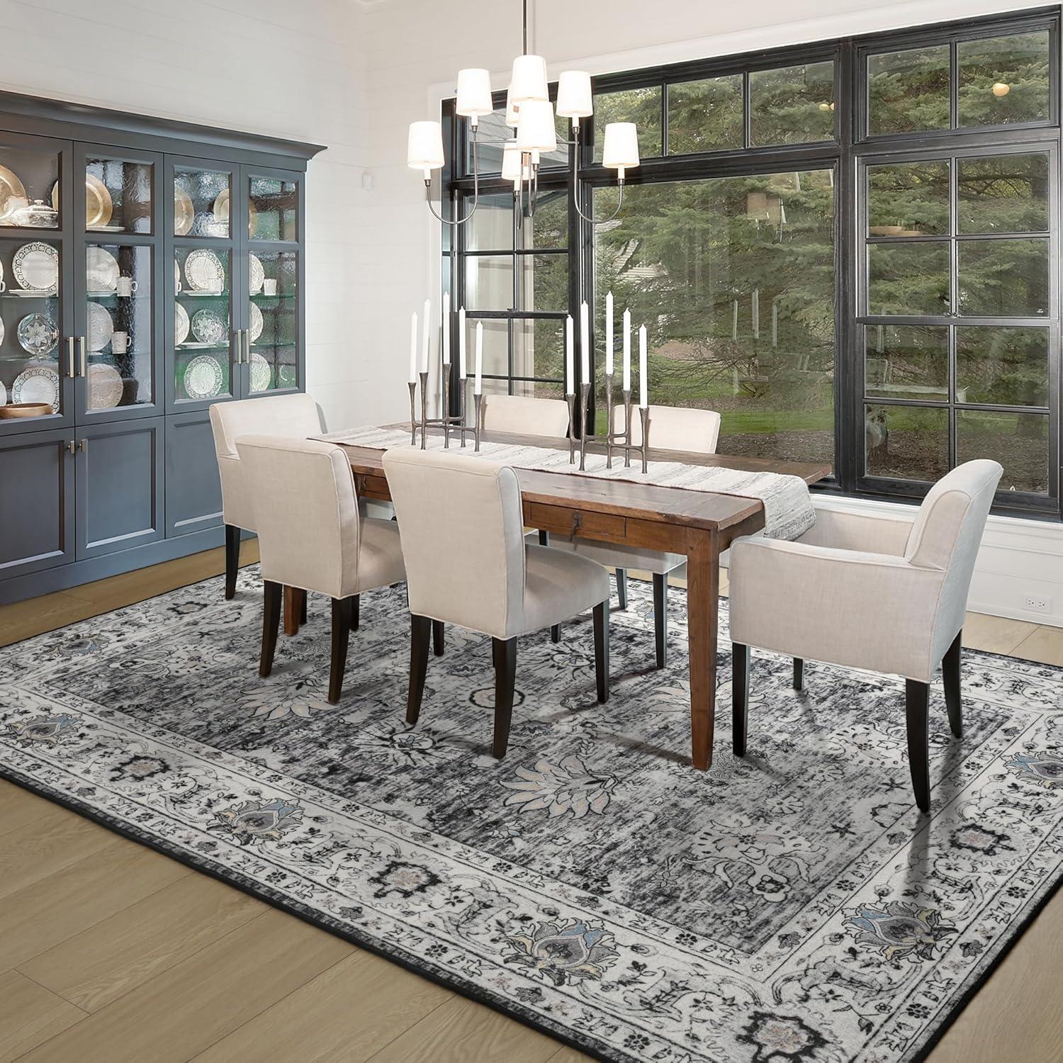 This washable area rug combines style and practicality in a way that suits various home environments. Crafted from high-quality faux wool fibers, its ultra-thin, low pile design ensures a soft, pleasant feel underfoot while making maintenance a breeze. The vintage floral pattern set against a muted grey background adds a timeless aesthetic that enhances living rooms, bedrooms, playrooms, and even home offices. Its lightweight construction means we can easily move or rearrange it whenever we want to refresh the look of a space.