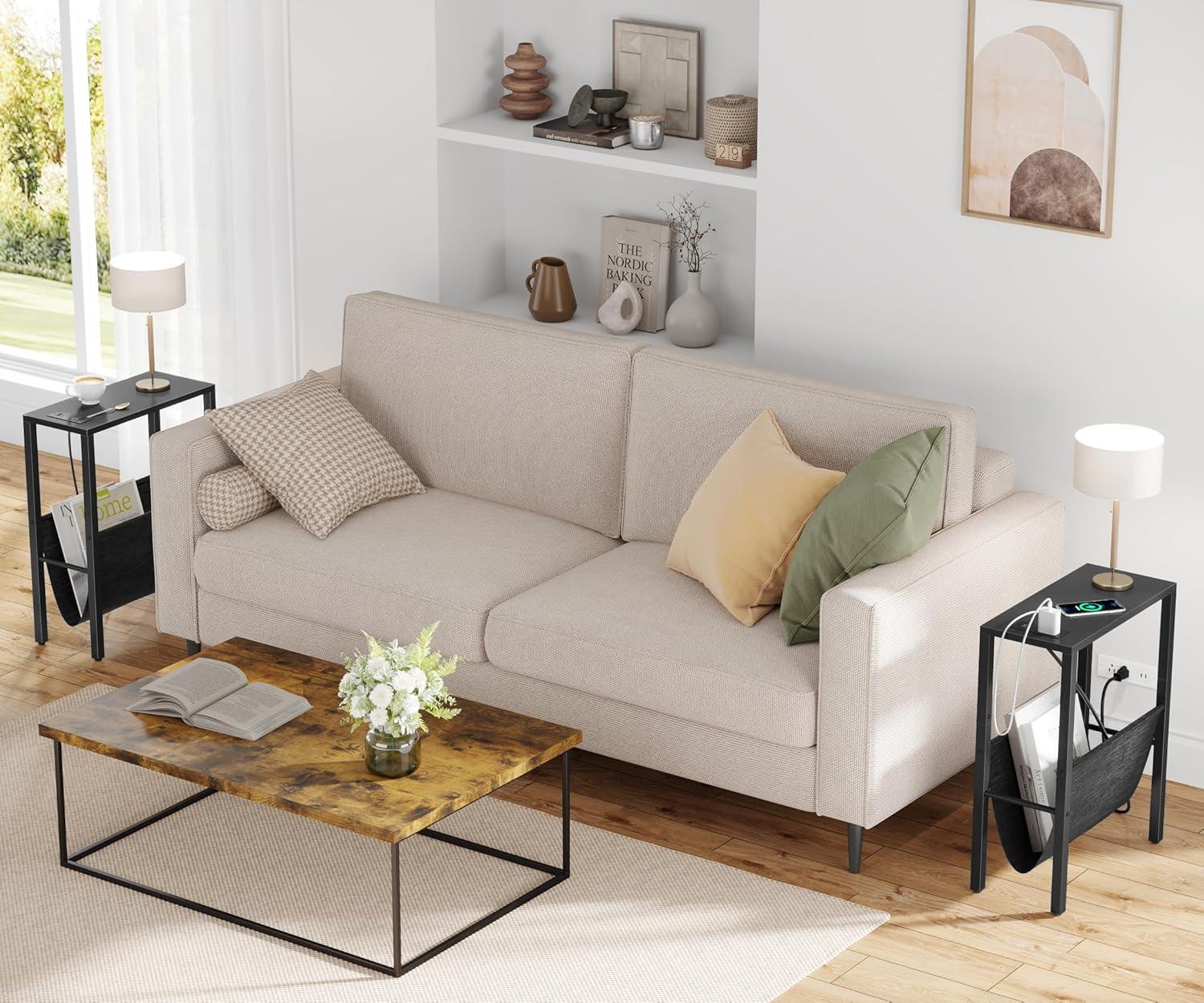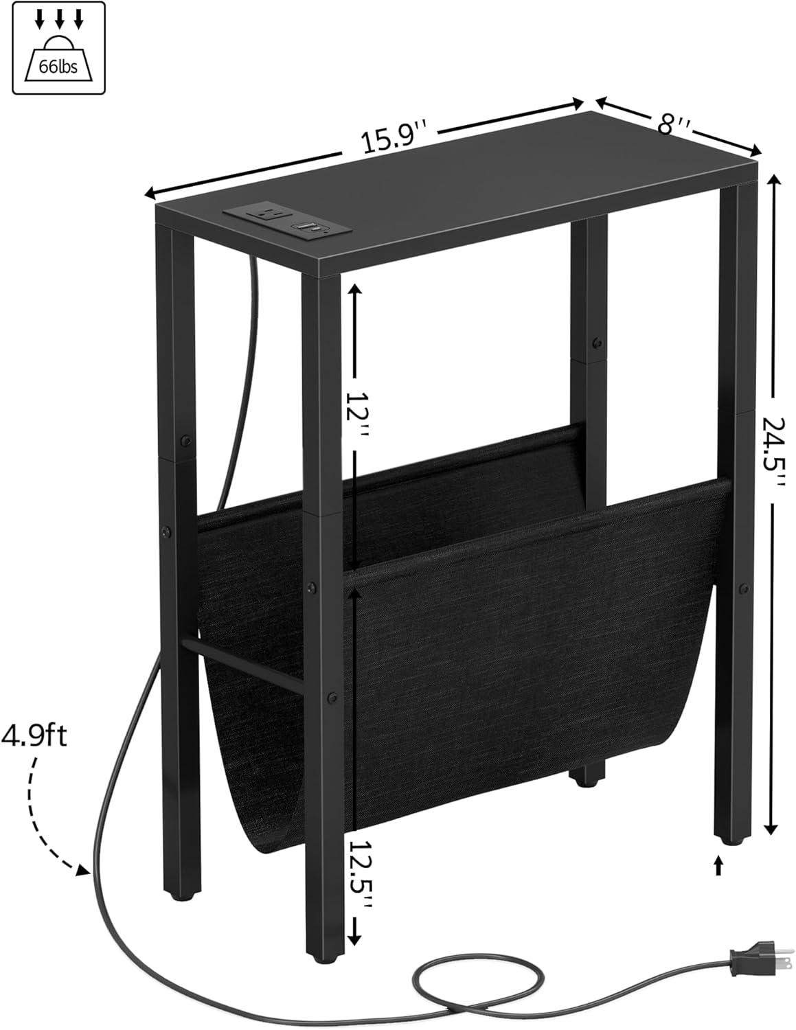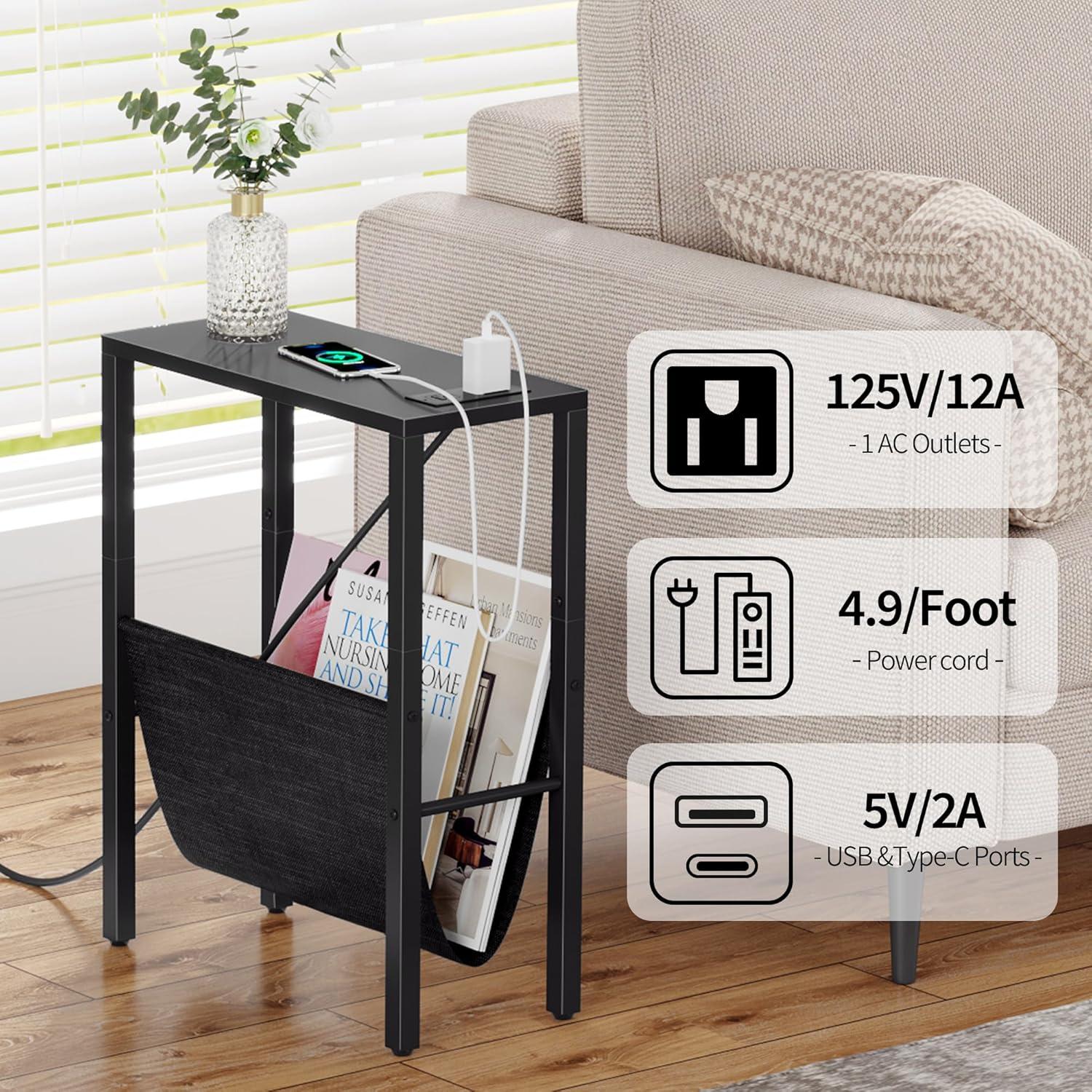 Designed specifically for tight spaces, these narrow side tables bring remarkable practicality without overwhelming your room.Measuring just 16.5″L x 7.1″W x 25.6″H, their slim profile fits effortlessly beside a sofa, bed, or in corners were larger furniture would be impractical. What truly sets them apart is the integrated charging station, featuring a 3-prong AC outlet, one USB port, and a type-C port, allowing us to power multiple devices together-no more fumbling for wall outlets or extra power strips. The two-tier design includes a storage pouch perfect for stashing magazines, books, or snacks, enhancing institution in compact living areas.