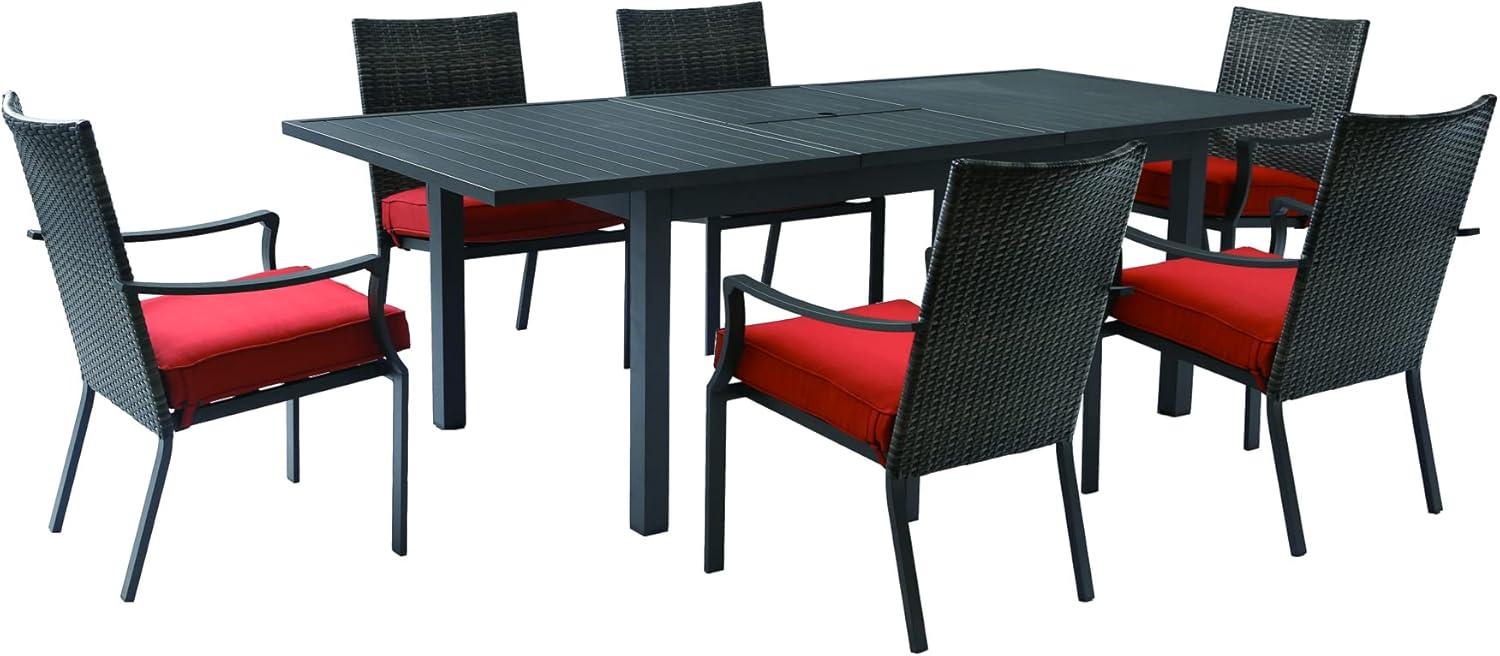 You step outside ‍and the set reads like a small, purposeful arrangement⁤ rather than a pile of outdoor furniture — a broad, hand-woven ⁢tabletop with six chairs that immediately change how the patio ⁣feels. It’s the Pacific Casual Somerset 7-piece dining‌ set in the corner, though you quickly shorten the name in conversation. The aluminum frame is cool where your hand rests, the woven seats give a faint, flexible​ bounce, and the deep-red cushions mute the sun’s glare without shouting. Open ⁤the butterfly leaf and the ‌table stretches outward, shifting​ sightlines and leaving you noting the slatted surface ⁤and⁣ the ‌way light threads through it.