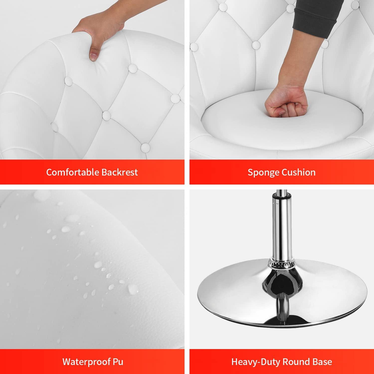 Sunlight skids across the chrome base and the white PU leather, and you instantly notice a quiet, reflective edge to the piece. You notice the PayLessHere Living Room Vanity chair — the white swivel vanity — looks smaller in person than its photos suggested, a rounded silhouette that keeps its presence modest. You run a hand along the back and the faux leather is smooth and slightly cool, the cushion yielding under your palm without feeling plush. A quick twist of the seat and it turns with little resistance; the chrome column rises smoothly and the casters roll almost silently across the floor. In the room it reads as everyday furniture: lightweight in visual weight, clean in line, and familiar under touch.